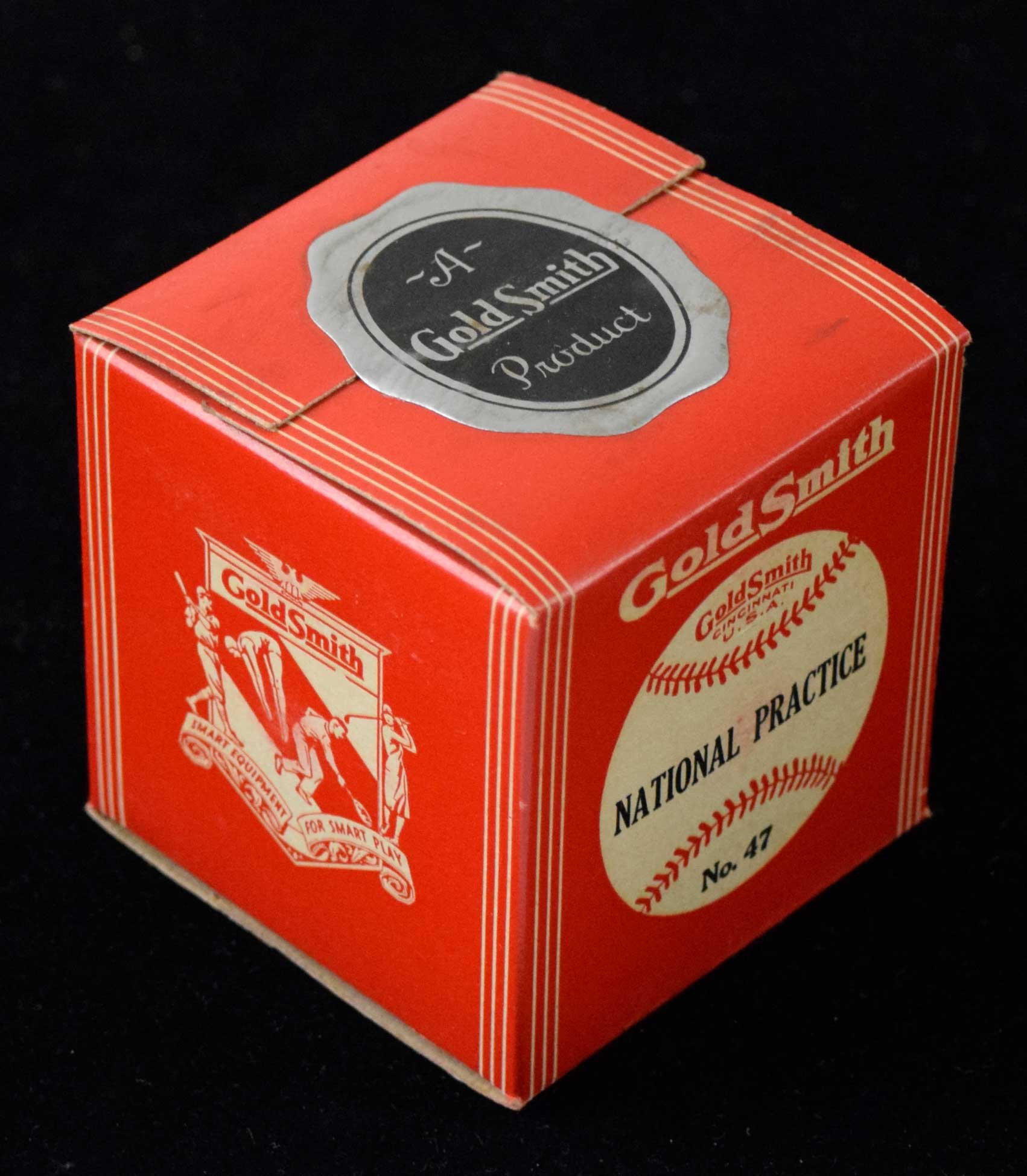 Description:GoldSmith brand baseball in original box, c.1930s (NM). National Practice No. 47 ball remains sealed within its unopened box with label stickers still securely intact. Minimal age/storage wear: NM overall