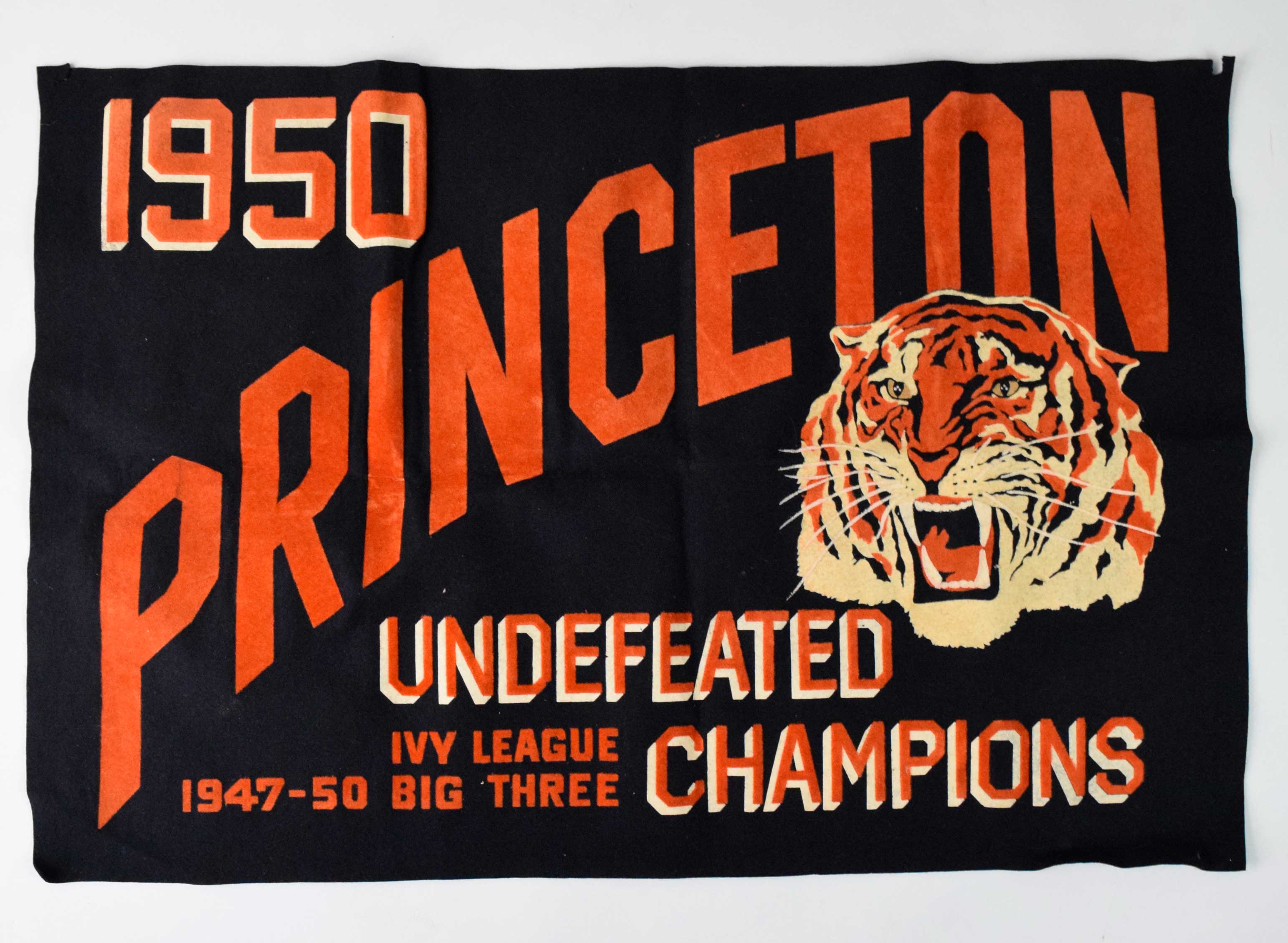 Description:Princeton Tigers 1950 Undefeated Champions football banner (EX/MT). 22.5"x34" banner celebrating their 9-0 season in which they outscored opponents 349-94, and won the Ivy League championship. Tack hole wear at the corners, with minimal wear otherwise: EX/MT