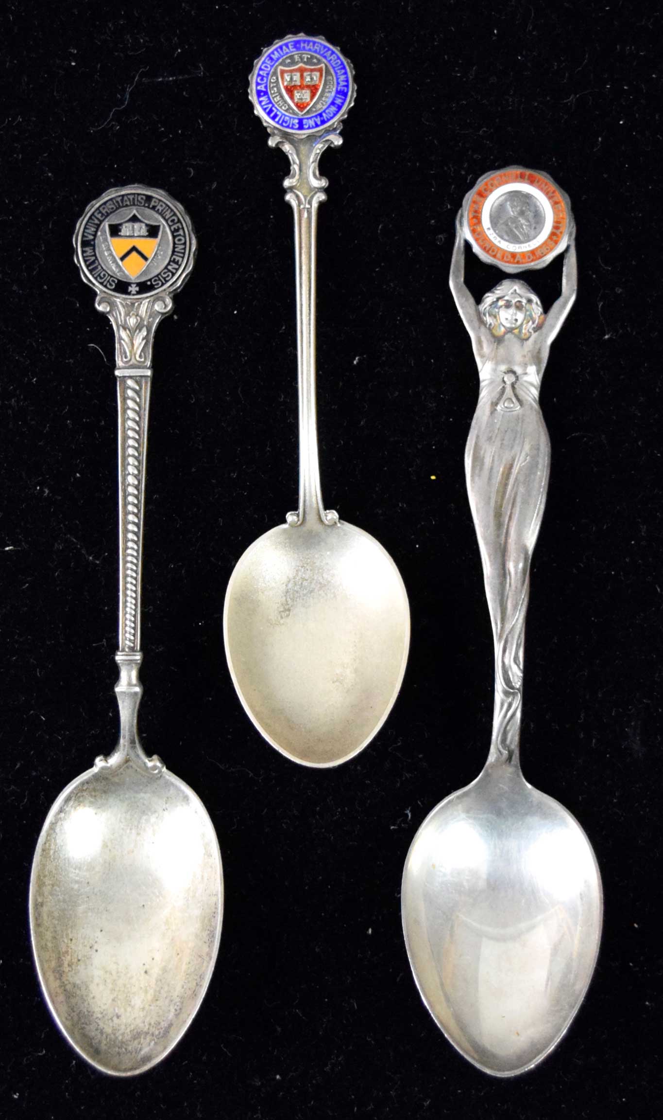 Description:Cornell, Harvard, and Princeton vintage silver spoons, c.early 1900s (EX/MT-NM). Includes 5.25" Cornell spoon, 5" Princeton spoon engraved "Apr. 30 '07", and 4.25" Harvard spoon. All three are marked "STERLING", and weigh a total of 1.7-oz (EX/MT-NM).
