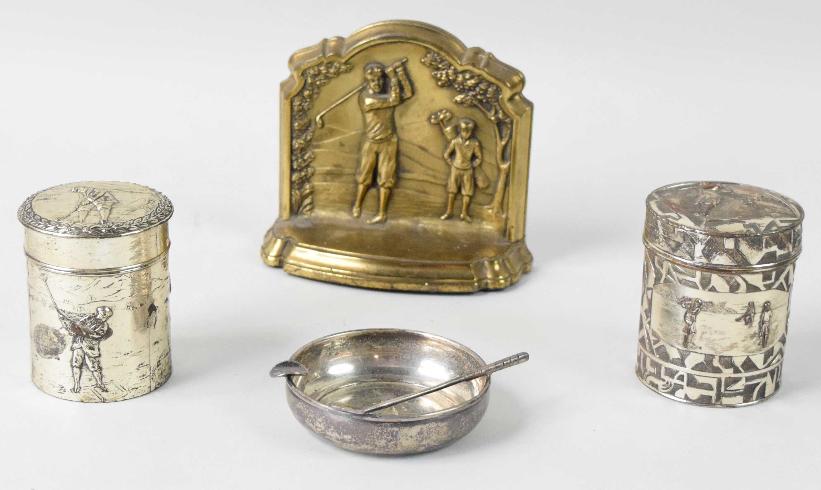 Lot of vintage golf memorabilia and display pieces (VG/EX-NM). Includes 2.3-oz ashtray marked "STERLING" (EX/MT), 3" and 3.25" tall lidded containers (EX-NM), and 5"x5.5" bookend (VG/EX crack).