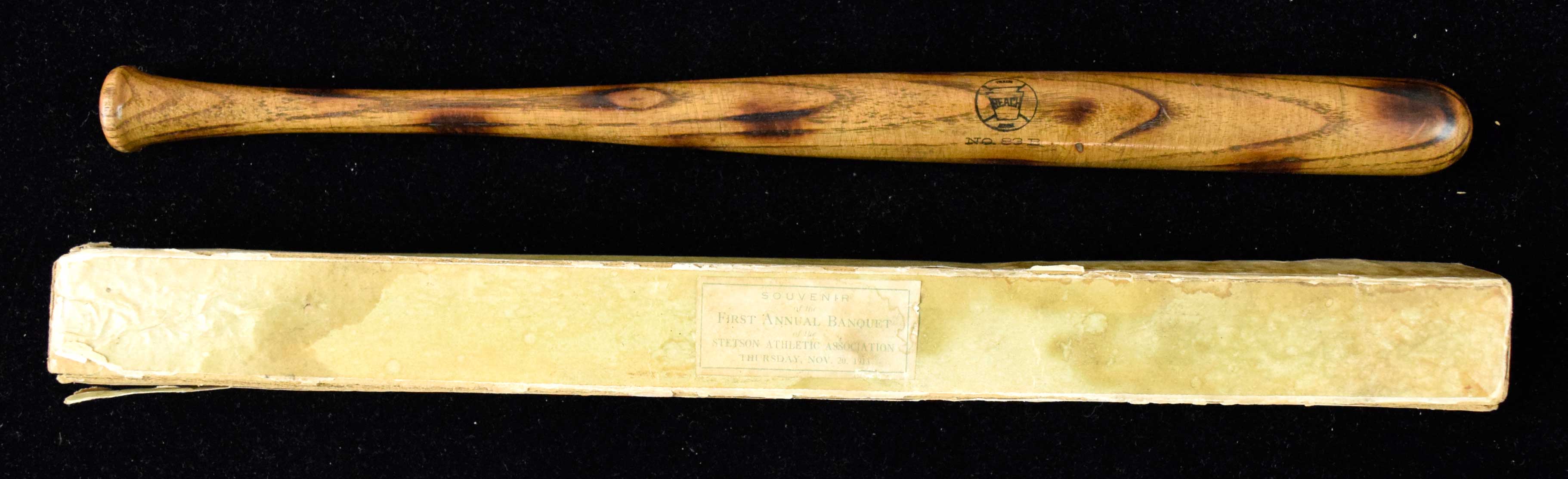 Description:1913 Reach mini bat with original box (bat NM, box VG). 14.5" mini bat with Reach logo at the center and No. 83B model number below (NM). Includes original box with "Souvenir of the First Annual Banquet of the Stetson Athletic Association" "Thursday, Nov. 20, 1913" paper label (VG age/handling wear and staining).