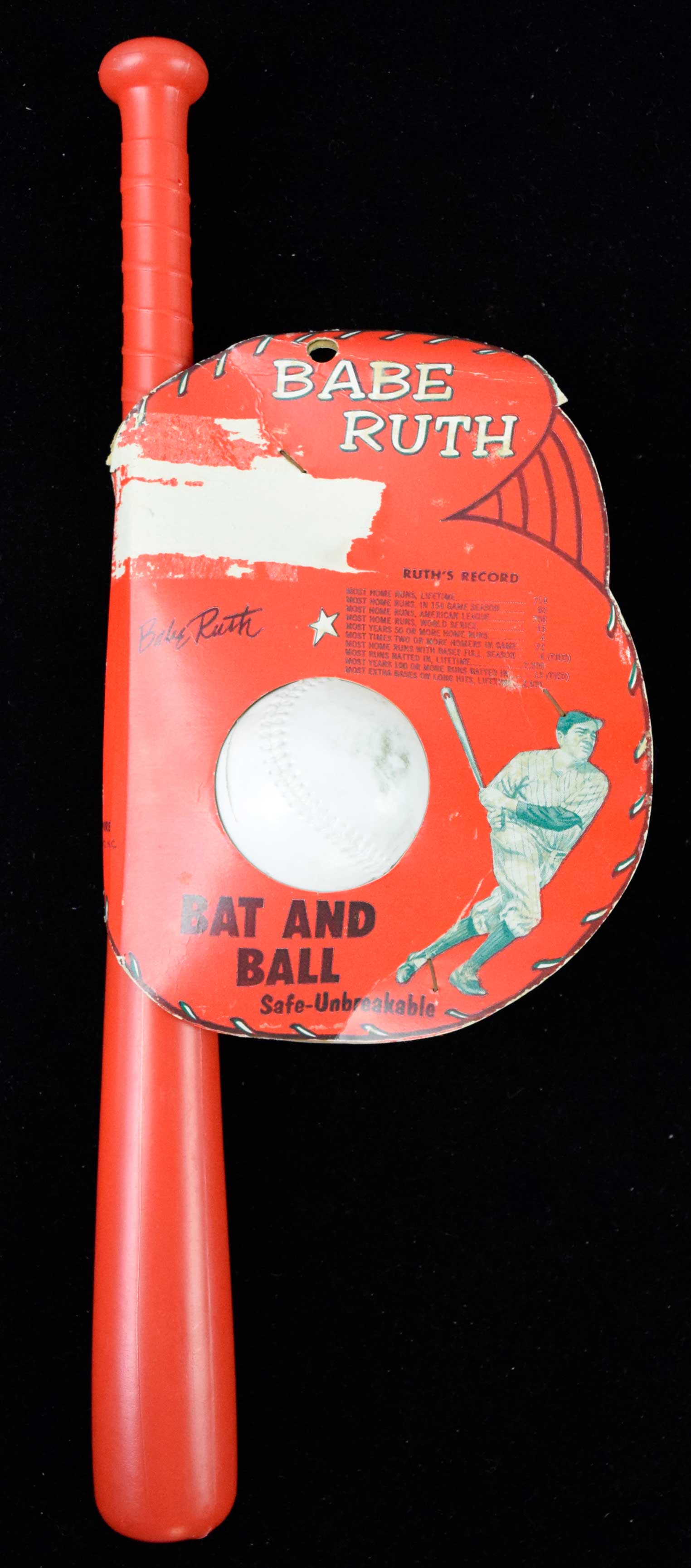 Description:Babe Ruth plastic bat and ball set, c.1960s (EX). Empire Toy Co. 18.25" plastic bat and ball still within original packaging which features Babe Ruth. Bat remains very high grade, ball has some scattered discoloration, and there is an area of paper loss on one side of the packaging: EX overall