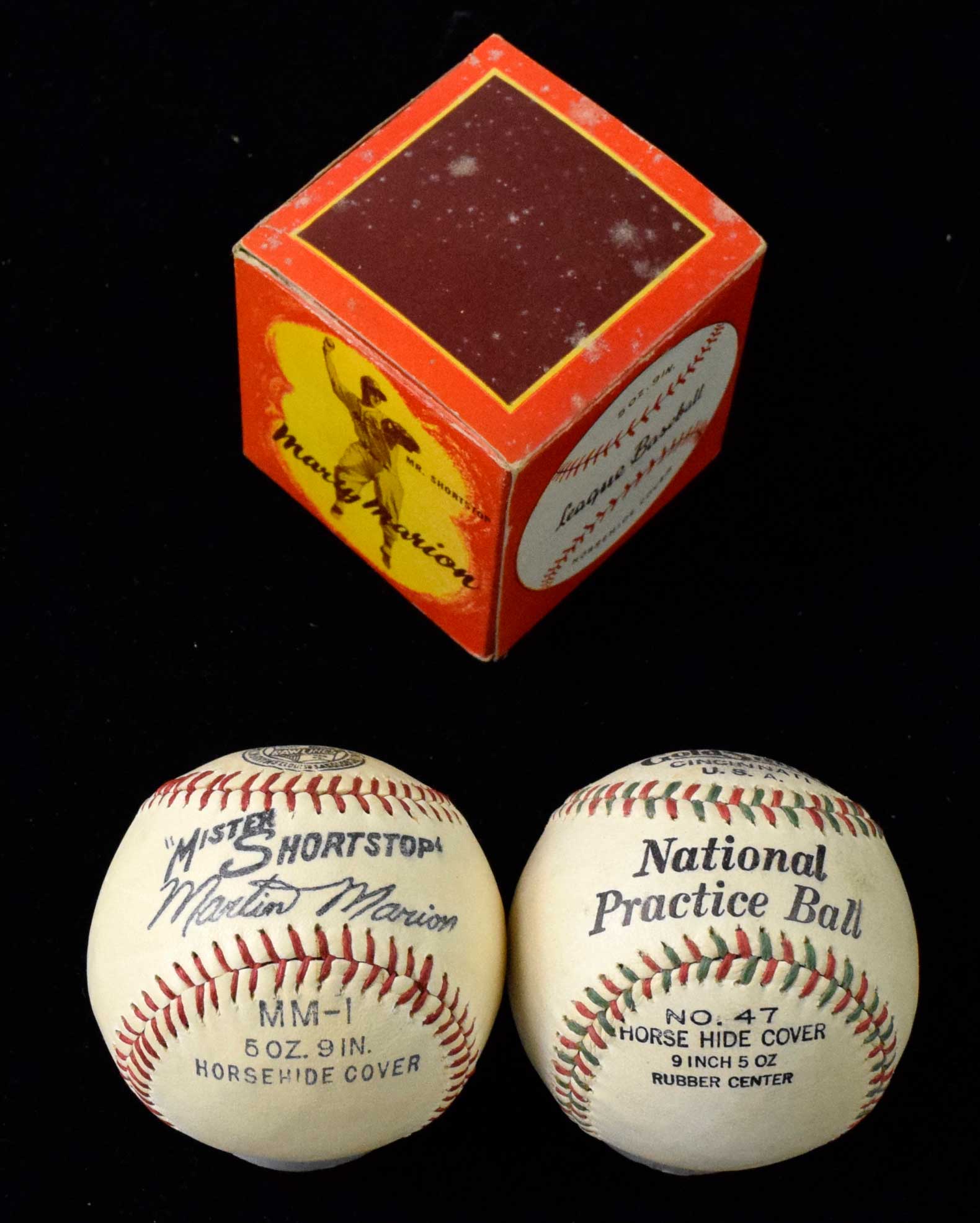 Description:Marty Marion endorsed baseball with original box & vintage GoldSmith baseball (EX-NM). Includes c.1930s GoldSmith No. 47 National Practice ball (EX/MT), and c.1940s-50s Rawlings MM-1 Marty Marion "Mister Shortstop" ball (EX/MT-NM) with original box (EX).