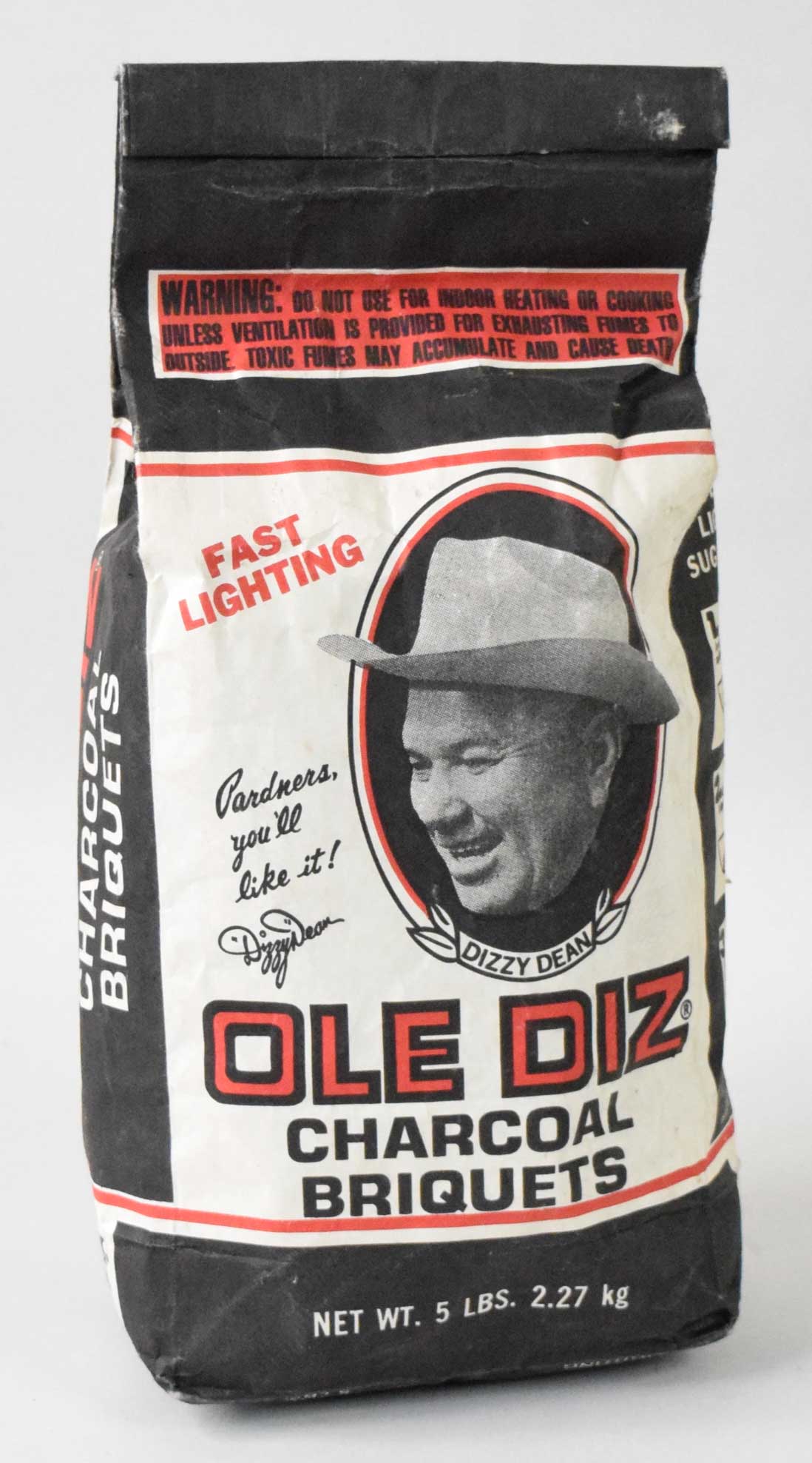 Description:Unopened bag of Dizzy Dean charcoal, c.1960s (EX/MT). 5-pound bag containing Ole Diz charcoal briquets. Remains unopened, with fairly minore handloing/storage wear: EX/MT