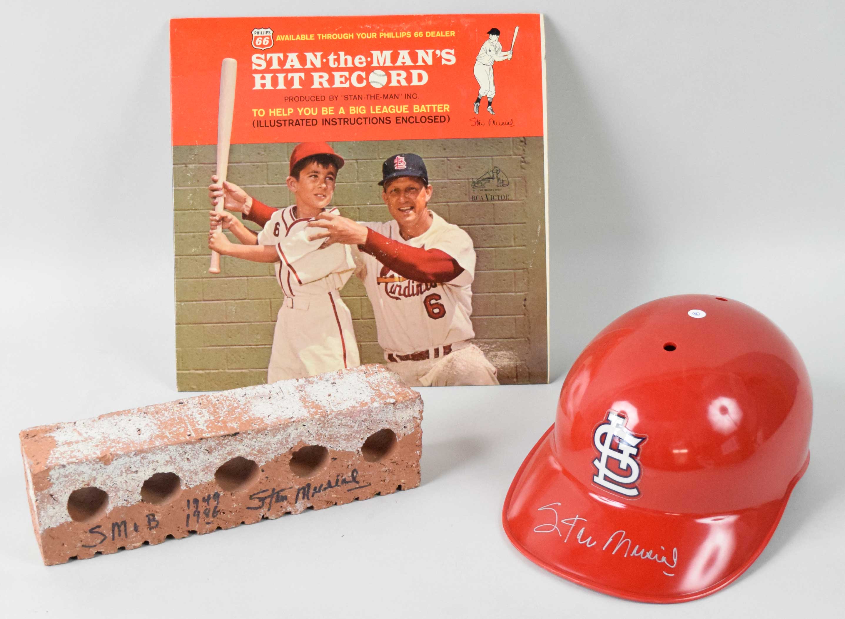 Description:Stan Musial memorabilia and autograph lot (EX-NM). Includes size 7-3/8 St. Louis Cardinals helmet signed by Musial in silver marker rating 9 out of 10, 3.25"x11.25" brick signed by Musial in black marker with "SM+B" "1949" "1986" inscription rating 8 out of 10 (likely from a Stan Musial & Biggie's building), and 1963 "Stan the Man's Hit Record": EX-NM