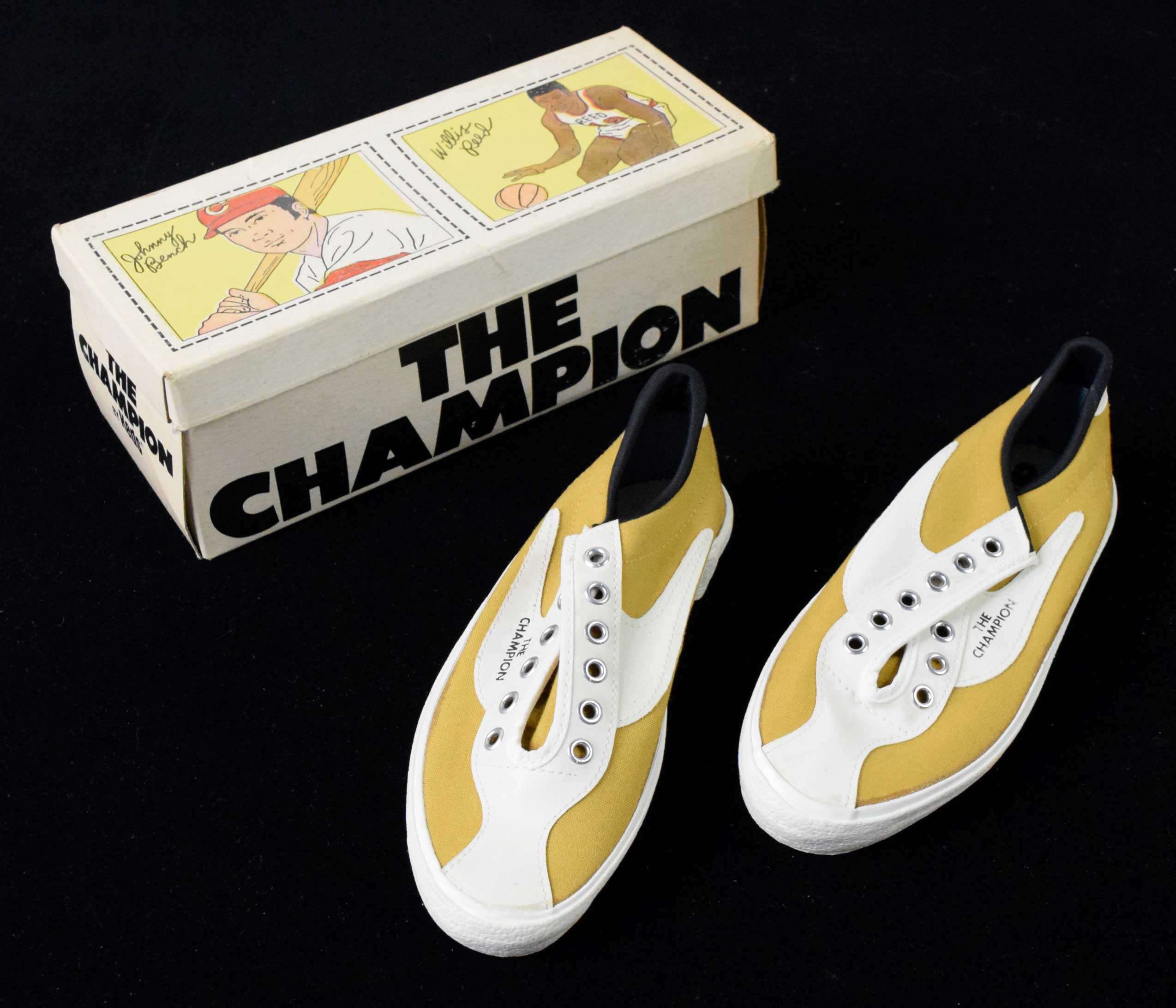 Description:1971 Keds shoes in original box with uncut Johnny Bench & Willis Reed cards (EX/MT-NM shoes, VG/EX-EX box). Boys size 3.5 shoes remain unworn and come with their original box which has the uncut Bench and Reed cards on the lid. Both have light surface wear, and there is a small crease at the very top and very bottom edges of the Bench card. Shoes: EX/MT-NM, Box: VG/EX-EX overall