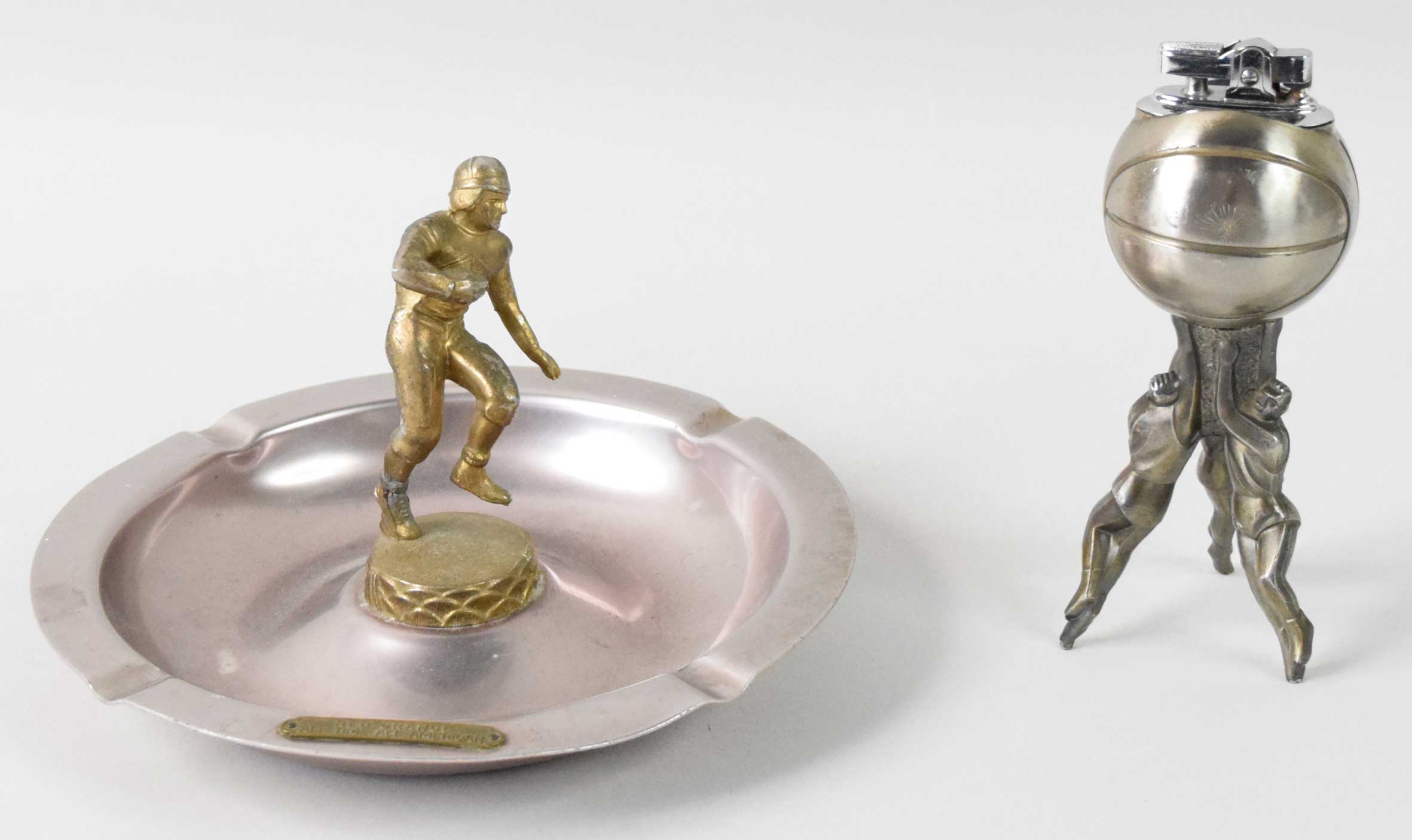 Description:Vintage basketball themed lighter and Red Grange ashtray (EX-NM). Includes c.1950s-60s 6" tall basketball lighter (EX), and c.1969 Dodge Inc. Trophies 8" "Red Grange" "All Time All American" ashtray with 4.5" tall figure of Grange at the center (EX/MT-NM).