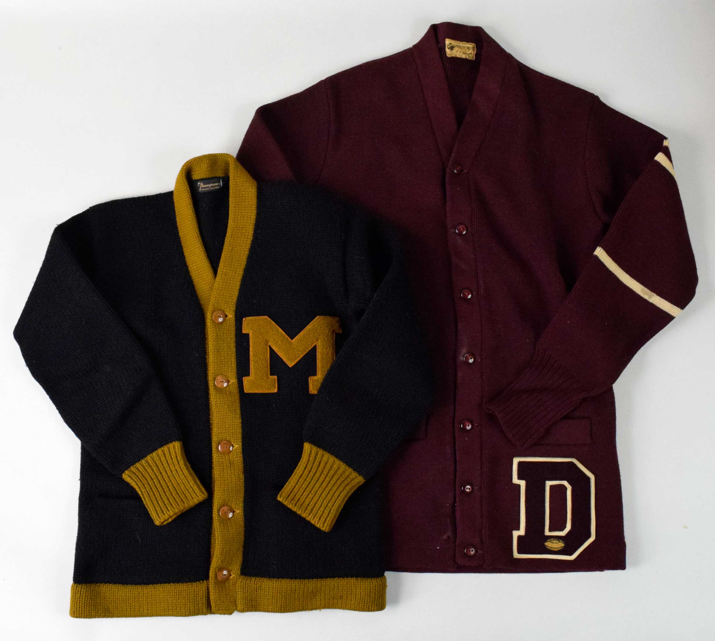 Description:Lot of (3) vintage letterman sweaters, c.1940s-50s (EX-EX/MT). Includes c.1940s "M" sweater with Imperial Knitting Co. and Thompson's Athletic Equipment tags along with the name "Boyd" stitched inside the tail, c.1950s B&M Knitwear "D" sewater with football patch, and c.1950s Burean Holloway "D" sweater: EX-EX/MT