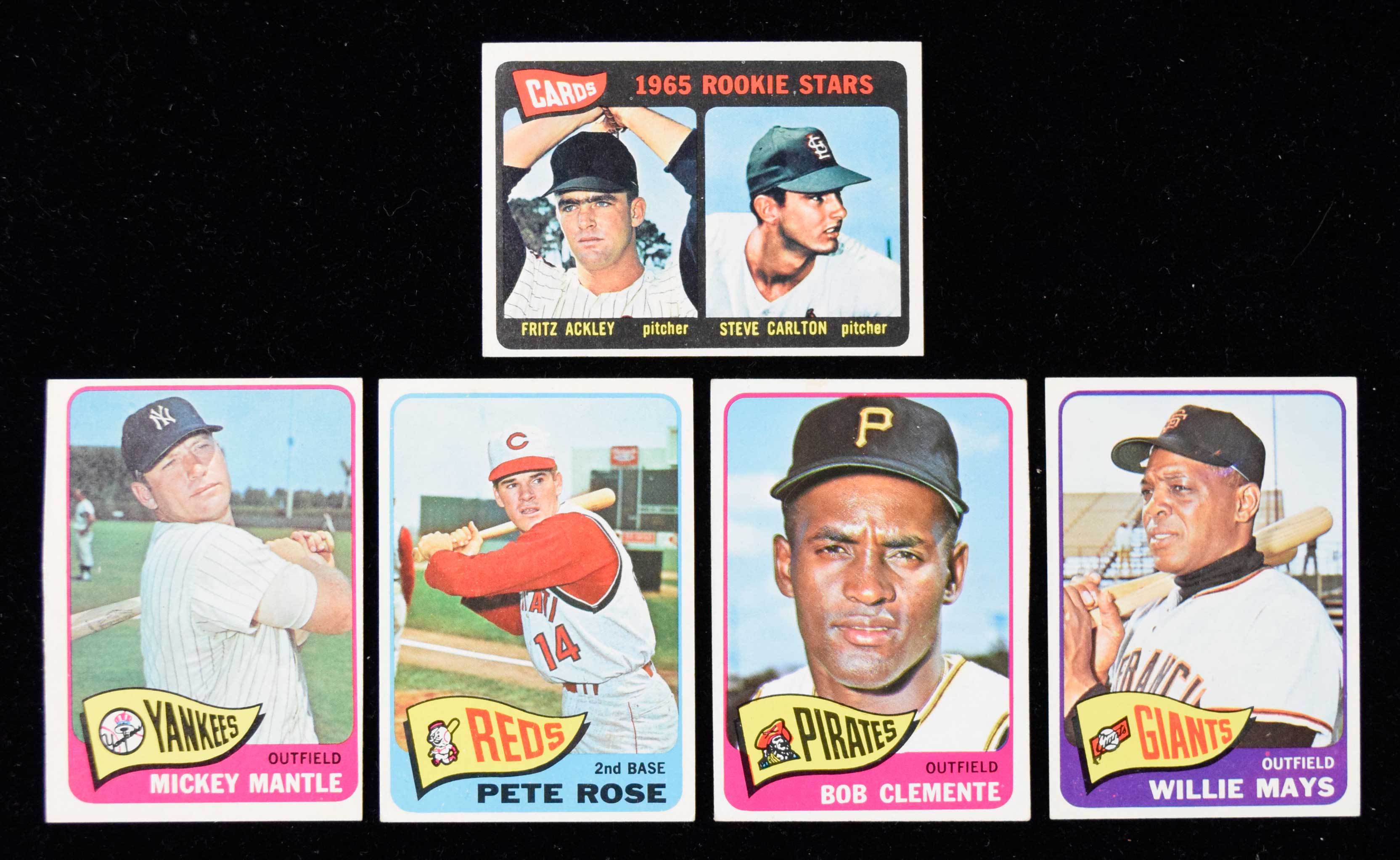 Description:1965 Topps Baseball complete set (598 cards) (see description) Average VG-VG/EX overall condition with GD-EX/MT general range. PLEASE NOTE: a portion of these cards are noticeably small and it is presumed that a good number have either been trimmed or would not meet minimum size requirements if submitted for third party grading. Some keys have been identified as such, others may fall in that category even if not specifically mentioned. Keys: #16 Morgan (VG), 120 Robinson (VG/EX OC), 130 Kaline (EX OC), 134 Mantle HR (VG), 150 Robinson (VG/EX-EX), 155 Maris (EX OC), 160 Clemente (VG), 170 Aaron (miscut), 207 Rose (VG), 250 Mays (EX), 300 Koufax (GD), 320 Gibson (VG/EX), 330 Ford (EX OC), 350 Mantle (VG OC), 377 Stargell (EX), 385 Yastrzemski (EX), 400 Killebrew (EX), 461 Niekro (EX/MT), 470 Berra (EX), 477 Carlton (EX), 510 Banks (EX-EX/MT), 526 Hunter (likely trimmed), 540 Brock (EX-EX/MT), and 581 Perez (EX wax on front): see description ($750-$1,500)