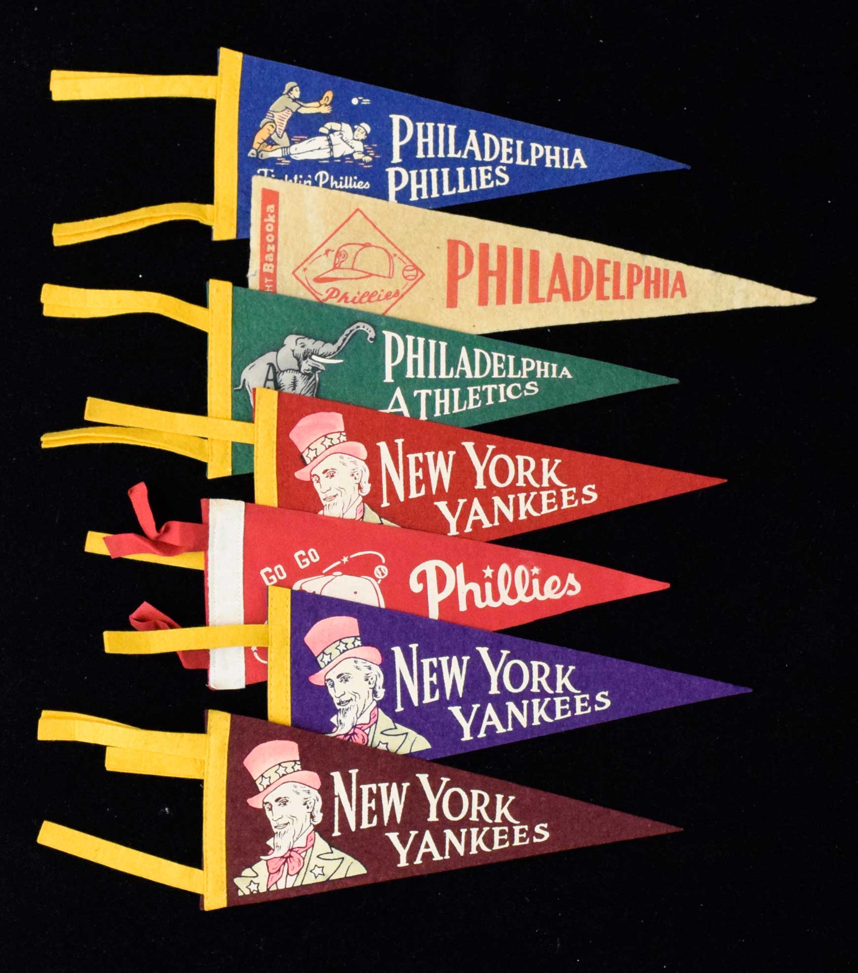 Description:Lot of (7) vintage MLB team mini pennants, c.1950s-60s (VG/EX-NM). Includes 1959 Bazooka 14" Philadelphia Phillies pennant (VG/EX); and (6) c.1950s-60s pennants measuring approx. 12": (2) different Phillies, Philadelphia Athletics, and (3) different New York Yankees (EX-NM).