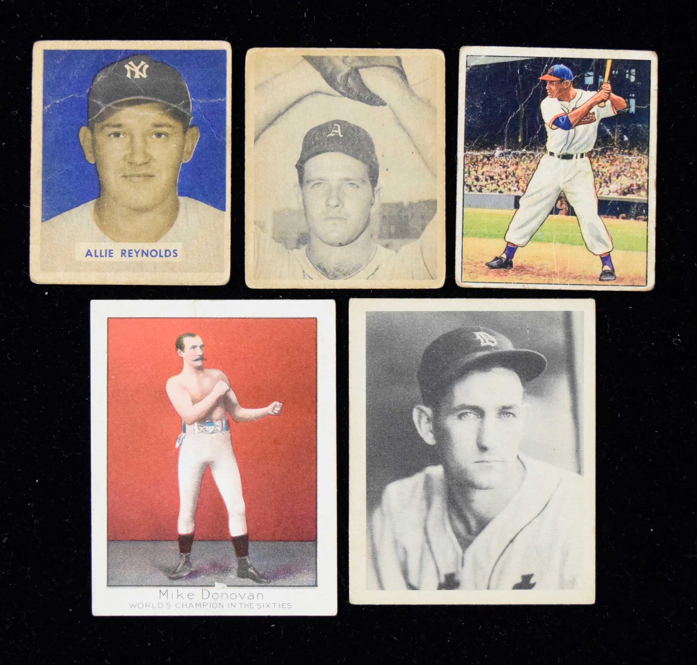 Description:Lot of (41) baseball and boxing cards from 1910-1975 (PR-NM). Includes (7) 1910 T220 Mecca Champion Athletes and Prize Fighters: George Dixon, Mike Donovan in the sixties, Mike Donovan of today, Billy Edwards, Terry McGovern, Jack O'Brien, and C.M. Daniels (back damage to all but Daniels); 1939 Play Ball Samples #50 Charlie Gehringer (VG); 1948 Bowman #s 31 (G/VG) and 37 (PR); 1949 Bowman #s 45, 90 (very PR), 114, and 184; 1950 Bowman #s 39 Larry Doby (GD), and 140 (FR/GD); 1951 Bowman #33 (G/VG); and 1975 7-Eleven Tulsa Oilers 24-card team set (EX-NM).