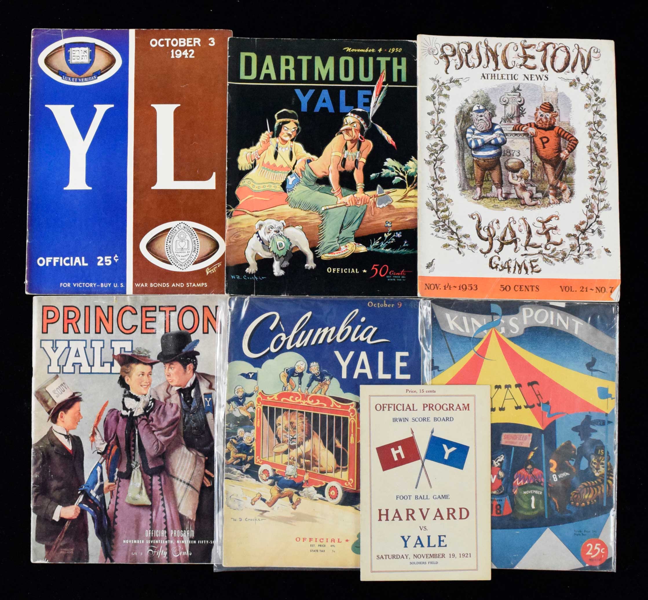 Description:Lot of (12) Yale football programs from 1921-1965 (GD-EX/MT). Includes 11/19/1921 vs Harvard (EX/MT), 10/3/1942 vs Lehigh, 9/27/1947 vs Kings Point Merchant Marines, 10/9/1948 vs Columbia, 11/4/1950 vs Dartmouth, 11/14/1953 vs Princeton, 11/17/1956 vs Princeton, 11/14/1959 vs Princeton, 11/17/1962 vs Princeton, 9/28/1963 vs Connecticut, 11/14/1964 vs Princeton, and 11/20/1965 vs Harvard. Most appear to average VG/EX-EX overall. Range: GD-EX/MT