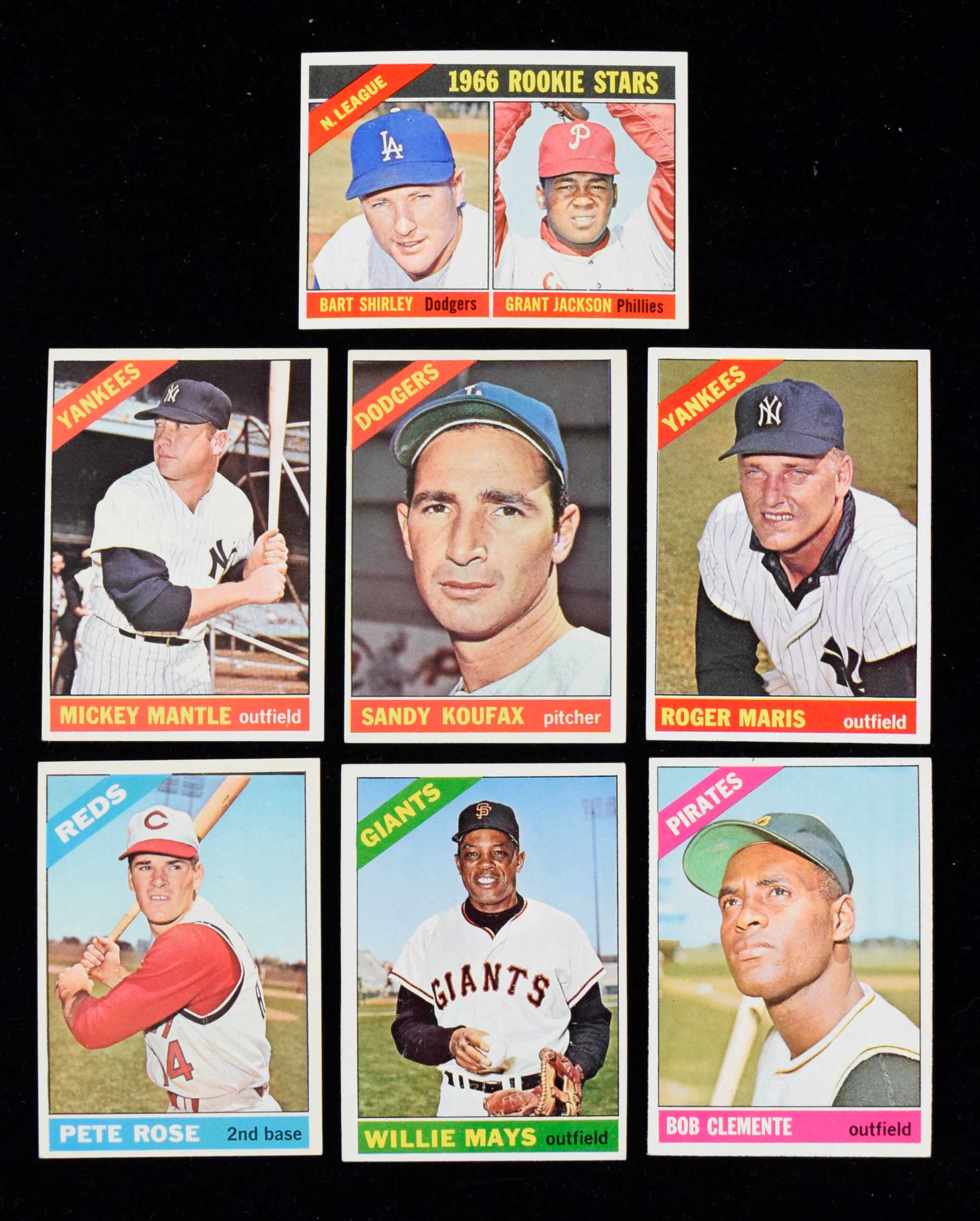 Description:1966 Topps Baseball near complete set (595 of 598 cards) (see description) Mid grade set in average VG/EX-EX overall condition with GD-EX/MT general range. PLEASE NOTE: a portion of these cards are noticeably small and it is presumed that a good number have either been trimmed or would not meet minimum size requirements if submitted for third party grading. Some keys have been identified as such, others may fall in that category even if not specifically mentioned. Missing #184, 193, and 277. Keys: #1 Mays (VG/EX), 30 Rose (EX), 50 Mantle (EX), 70 Yastrzemski (VG, slight miscut), 72 Perez (EX OC), 100 Koufax (EX), 110 Banks (VG), 120 Killebrew (likely trimmed), 125 Brock (GD), 126 Palmer (EX, minor wax stain on front), 160 Ford (EX), 195 Morgan (EX, wax on front), 254 Jenkins (EX, miscut), 288 Sutton (VG), 300 Clemente (EX-EX/MT), 310 Robinson (EX, wax on front), 320 Gibson (EX/MT OC), 365 Maris (EX/MT), 390 Robinson (EX miscut), 410 Kaline (EX-EX/MT), 500 Aaron (likely trimmed), 526 Twins (VG/EX), 530 Roberts (EX/MT), 540 McLain (EX-EX/MT), 544 Rookies (eX/MT), 547 Clarke (likely trimmed), 550 McCovey (EX), 580 Williams (EX/MT-NM OC), 583 Tigers (likely trimmed), 591 Jackson (EX), and 598 Perry (VG/EX): see description ($750-$1,500)