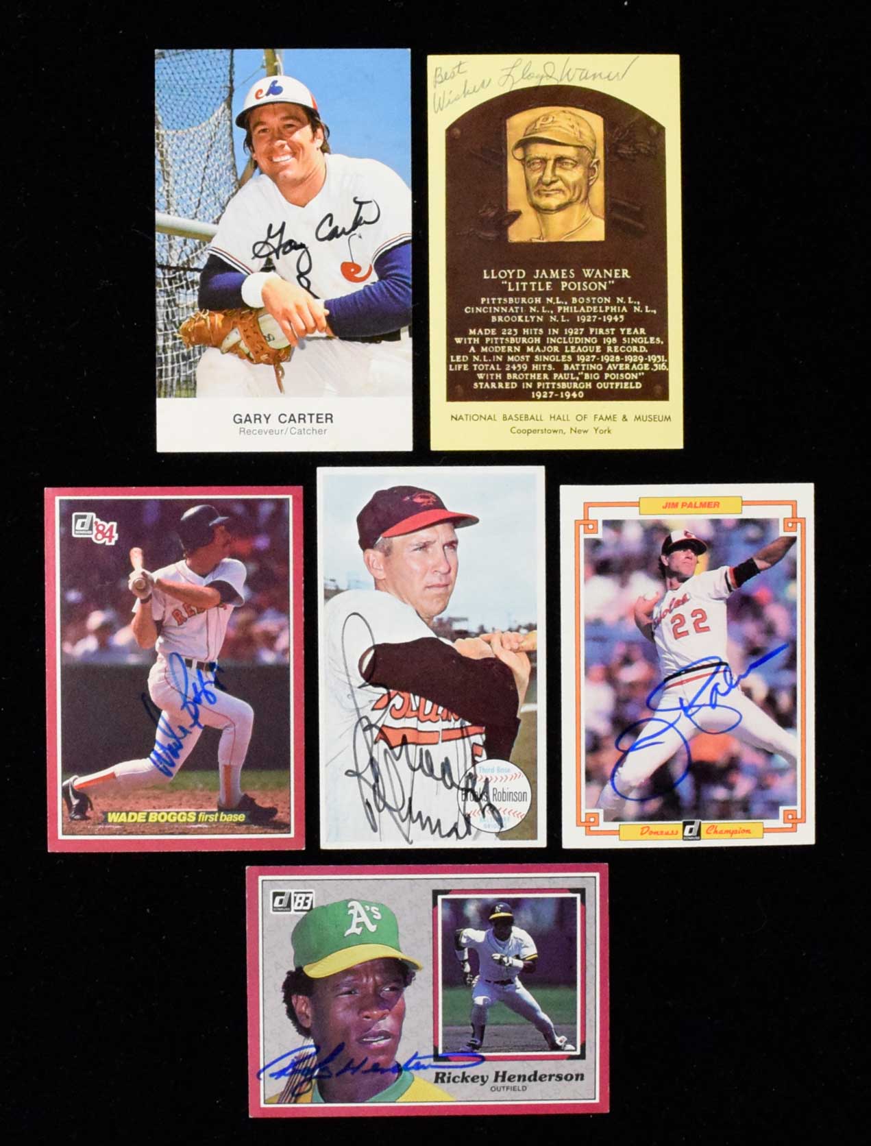 Description:Nice lot of Baseball HOFers autographs (GD-NM/MT). Includes 1939-46 Exhibit Salutations card signed by Bob Feller (GD); 3.25"x5.75" photo signed by Enos Slaughter with "1955" year inscription; HOF plaque postcards signed by Lloyd Waner and James "Cool Papa" Bell; Team issue photo card signed by Gary Carter; 3"x3.5" publication photo signed by Stan Musial; 1983 Babe Ruth FDC signed by Eddie Mathews; 1964 Topps Giants #50 signed by Brooks Robinson; 1983 Perma-Graphics card signed by Carl Yastrzemski; (2) 1983 Donruss Action All-Stars #22 signed by Rickey Henderson; 1984 Donruss Action All-Stars #s 9 signed by Rickey Henderson, and 22 signed by Wade Boggs; (2) 1984 Donruss Champions #s 16 signed by Wade Boggs, and 35 signed by Jim Palmer; 1985 Donruss Action All-Stars #38 signed by Wade Boggs; 1985 Leaf #208 signed by Rickey Henderson; and 1986 Donruss All-Stars "Pop-Ups" card signed by Ozzie Smith. Signatures rate 7 to 10 (avg 8/9) out of 10. Most items appear to average EX/MT-NM overall. Range: GD-NM/MT