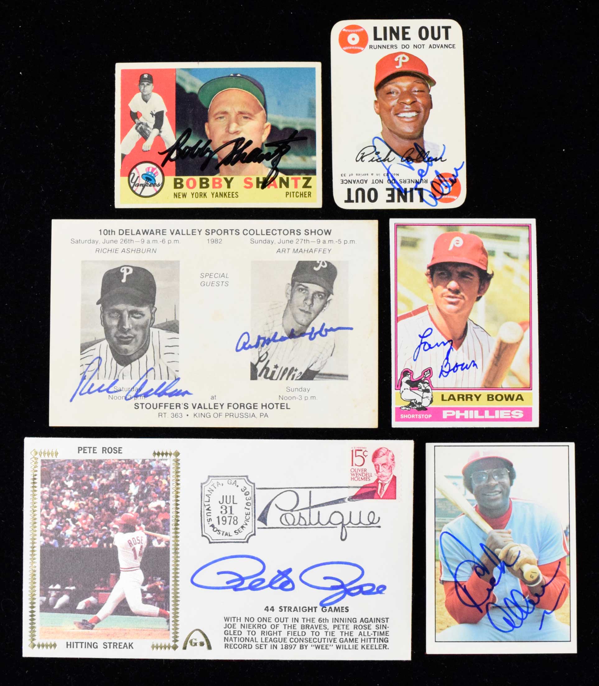 Description:Lot of assorted baseball autographs - mostly Philadelphia Phillies (VG-NM/MT). Includes 3.5"x5.5" 1982 sports collectors show fluer dual-signed by Richie Ashburn and Art Mahaffey; 1978 Hitting Streak postal cover signed by Pete Rose; 1968 Topps Game #23 signed by Dick Allen; (4) 1975-76 SSPC #473 signed by Dick Allen; (2) 1983 Phillies postcards signed by Dick Allen; 1960 Topps #315 signed by Bobby Shantz; Vintage 4"x5" photo signed by Bobby Shantz (personalized); 3.5"x5" photo signed by Al Brancato; 1976 Topps #145 signed by Larry Bowa; 1981 Topps #120 signed by Larry Bowa; 1985 Donruss Highlights #52 signed by Willie McGee; (2) 1987 Topps #227 signed by Jamie Moyer; and (2) sheets of 1984 Phillies stationery signed by Joe Lefebvre. Signatures rate 6/7 to 10 (avg 8/9) out of 10. Most items appear to average EX/MT-NM overall. Range: VG-NM/MT