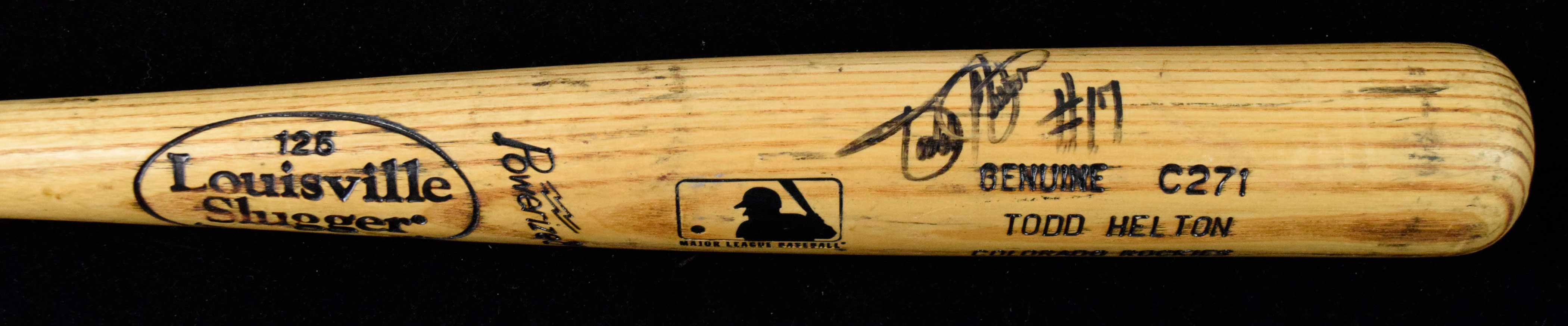 Description:Todd Helton signed professional model baseball bat, c.2000-01 (EX). 34.25" Louisville Slugger C271 Todd Helton model bat with his #17 written on the cupped end (number blacked out on the knob). Helton signed the bat in black marker. Signature rates 7 out of 10. The bat shows very fine use with ball marks and Mota stick residue: EX