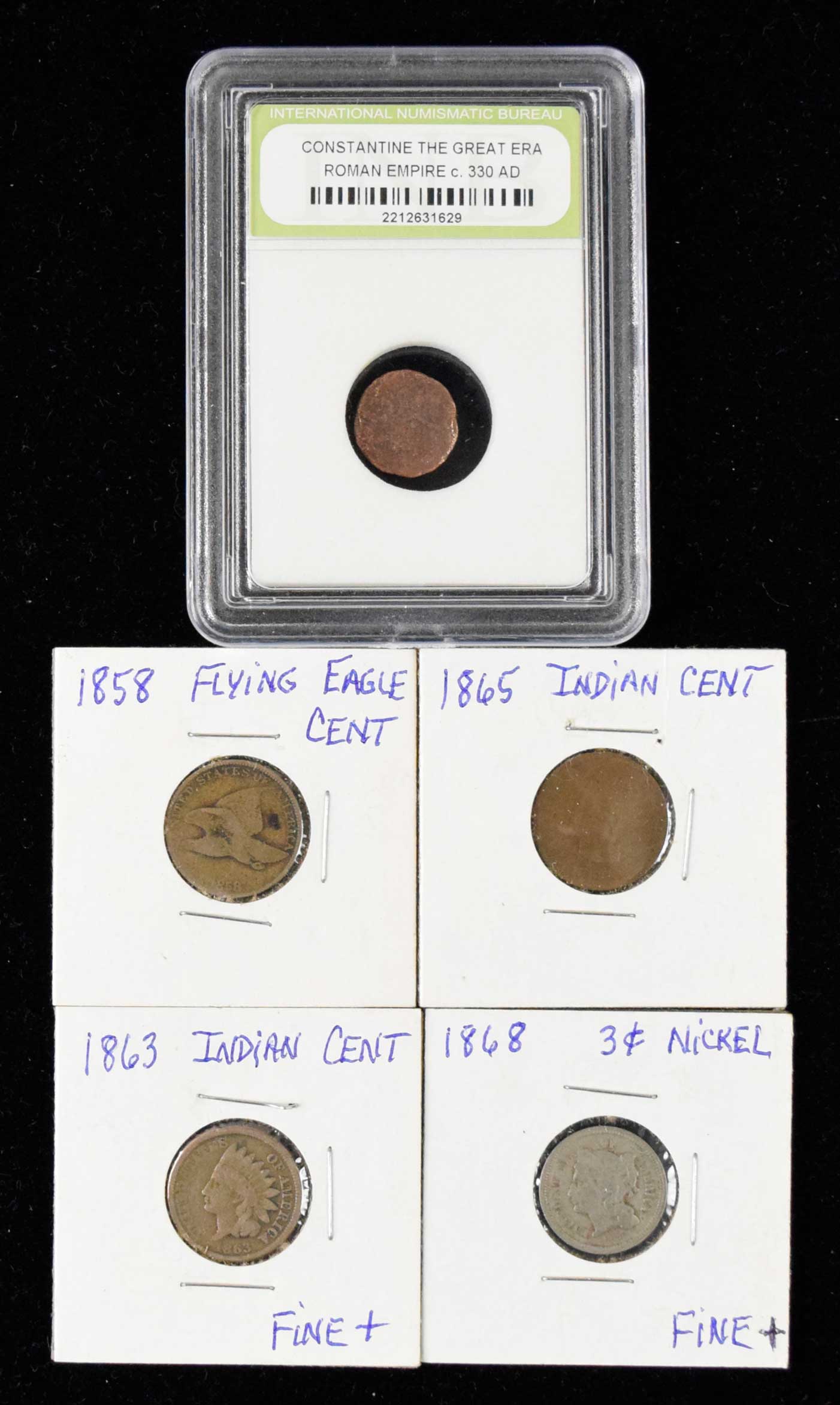 Lot of (10) vintage coins, c.330-1875 (FR/GD-EX/MT). Includes c.330 Constantine The Great era Roman Empire coin (FR/GD), 1858 Flying Eagle Cent (GD), 1863 Indian Cent (EX), 1865 two-cent (VG/EX), 1865 Indian Cent (VG/EX), 1867 Shield five-cent (VG), (2) 1868 Shield five-cents (VG-VG/EX), 1868 three-cent nickel (EX/MT), and 1875 Indian Cent (EX).