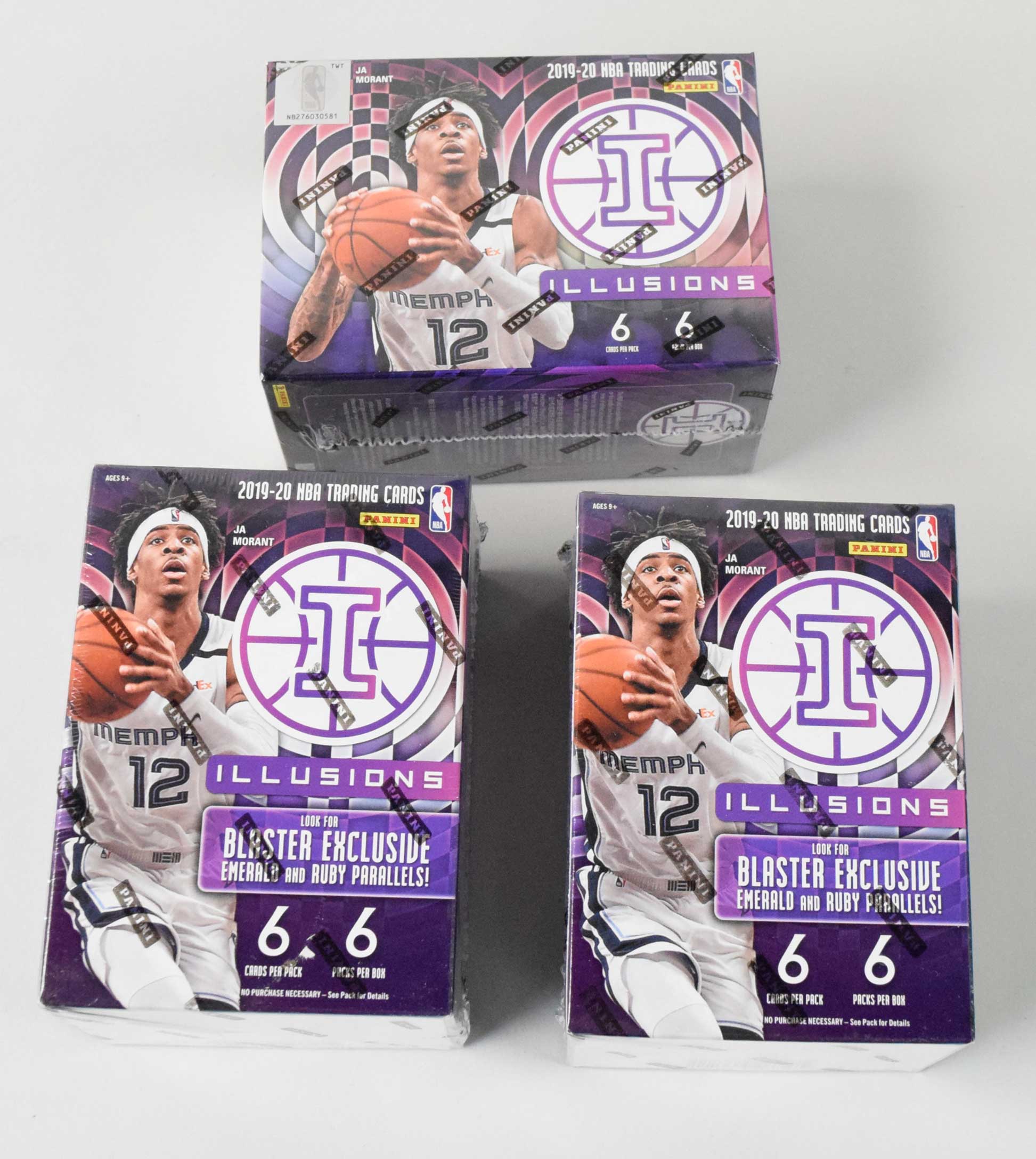 Description:Lot of (3) 2019-20 Panini Illusions basketball blaster boxes (NM/MT). Each box contains 6-packs with 6-cards per pack. All remain factory wrapped, with minimal handling wear: NM/MT