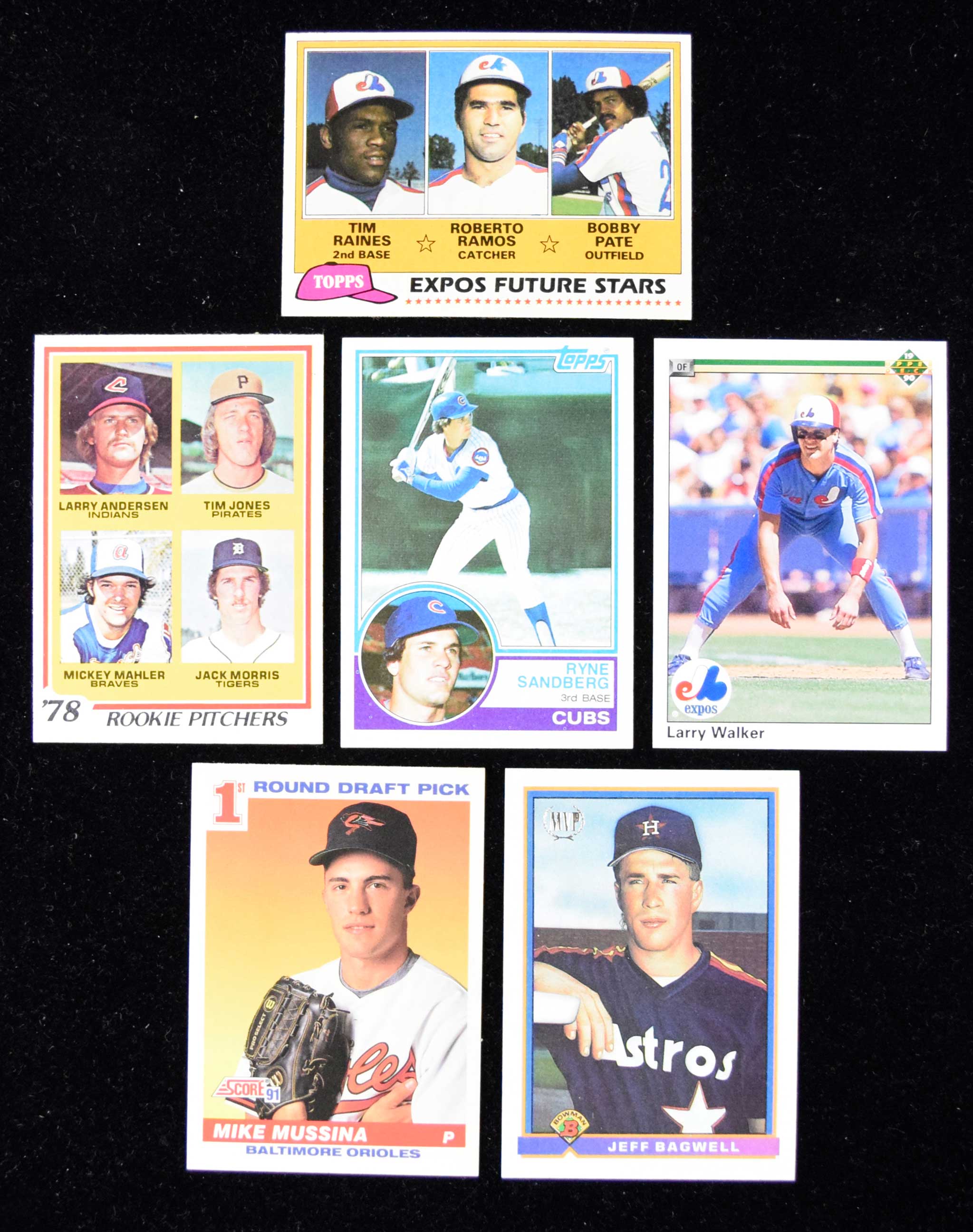 Lot of (78) baseball stars and HOFers rookie cards from 1976-1994 (GD-NM/MT). Includes 1976 Topps #98 Dennis Eckersley (GD-G/VG); (2) 1978 Topps #703 Jack Morris; 1981 Topps #479 Tim Raines; 1983 Topps #83 Ryne Sandberg; 1988 Donruss #34 Roberto Alomar; 1989 Topps #647 Randy Johnson; (31) 1989 Donruss #635 Curt Schilling; 1989 Score Traded #77T Johnson; 1990 Topps #757 Larry Walker; 1990 Bowman #s 117 Walker, and 320 Frank Thomas; 1990 Donruss #578 Walker; (2) 1990 Upper Deck #17 Sammy Sosa; (2) 1990 Upper Deck #466 Walker; 1991 Topps Traded #101T Ivan Rodriguez; (4) 1991 Bowman #68 Jim Thome; 1991 Bowman #97 Mike Mussina; (3) 1991 Bowman #183 Jeff Bagwell; (3) 1991 Bowman #272 Rodriguez; 1991 Bowman #569 Chipper Jones; 1991 Leaf "Gold Rookies" #BC12 Mussina; (2) 1991 Score #383 Mussina; (2) 1991 Score #671 Jones; 1991 Studio #172 Bagwell; 1991 Upper Deck #755 Bagwell; (9) 1991 Upper Deck Final Edition #55F Rodriguez; 1992 Topps #156 Manny Ramirez; and 1994 Action Packed Minors #1 Alex Rodriguez. Most appear to average NM overall. Range: GD-NM/MT