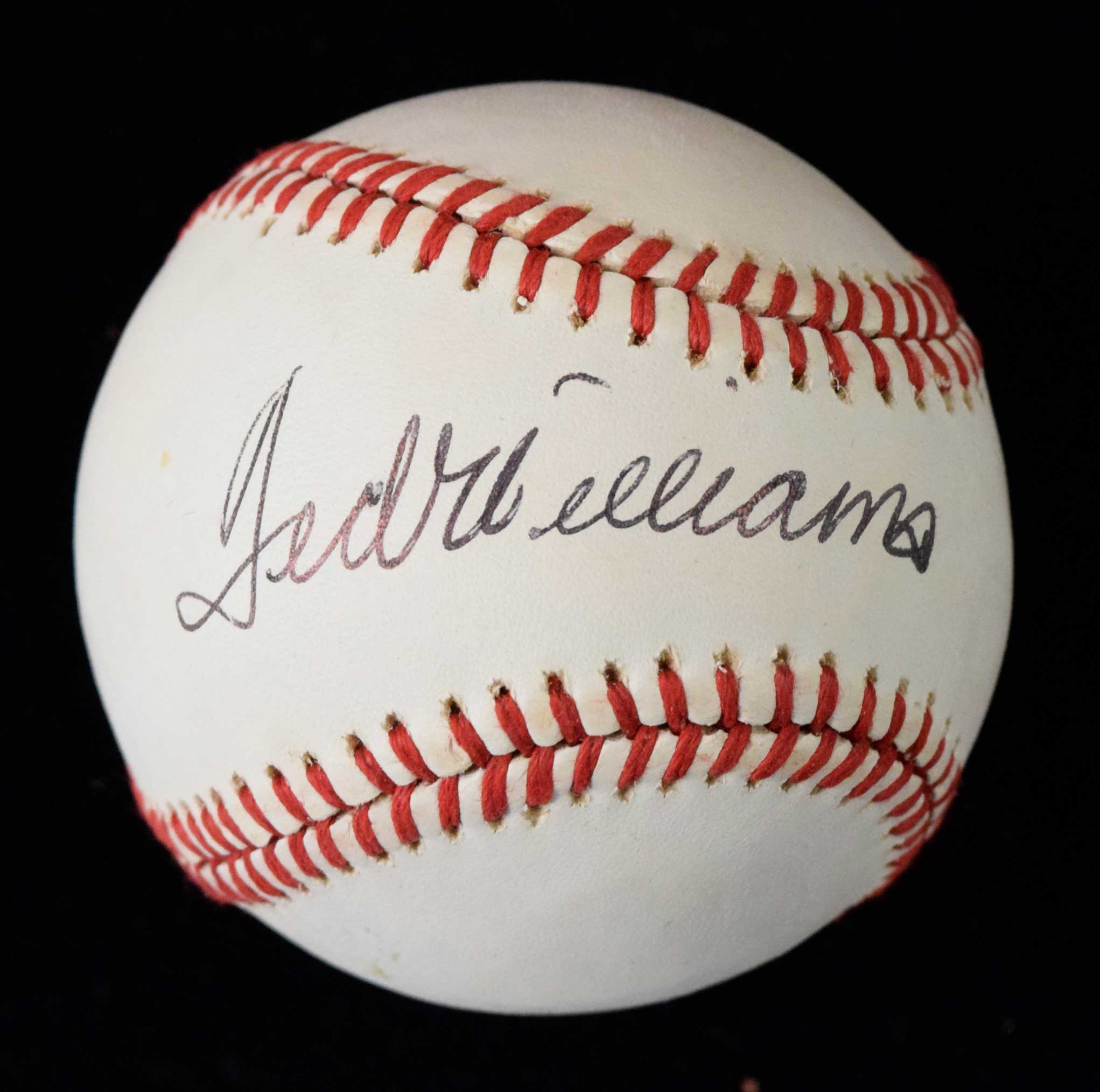Description:Ted Williams signed B.Brown AL baseball (EX/MT). Williams signed the sweet spot in black ink. Signature rates 8/9 out of 10. Scattered spots of light toning: EX/MT