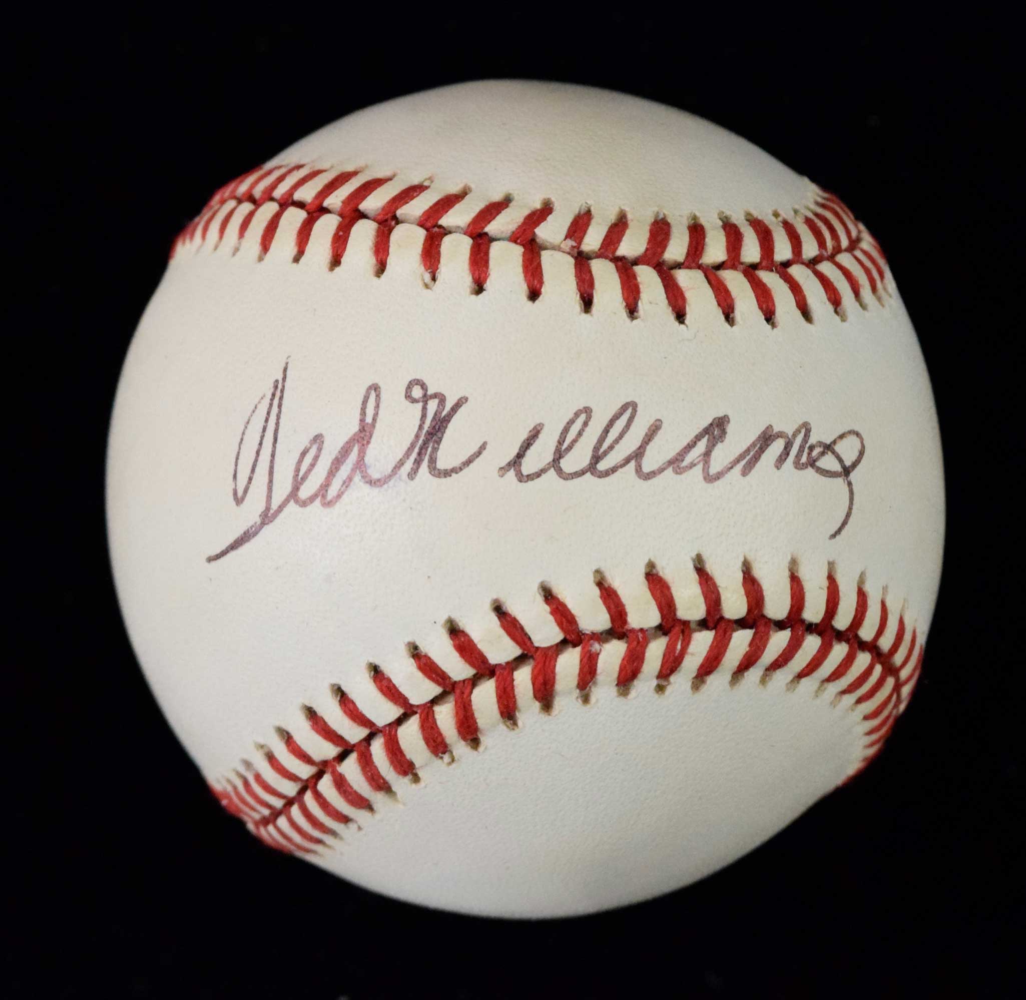 Description:Ted Williams signed B.Brown AL baseball (EX/MT). Williams signed the sweet spot in black ink. Signature rates 7 out of 10 due to a slight smudge. Very light, even toning: EX/MT