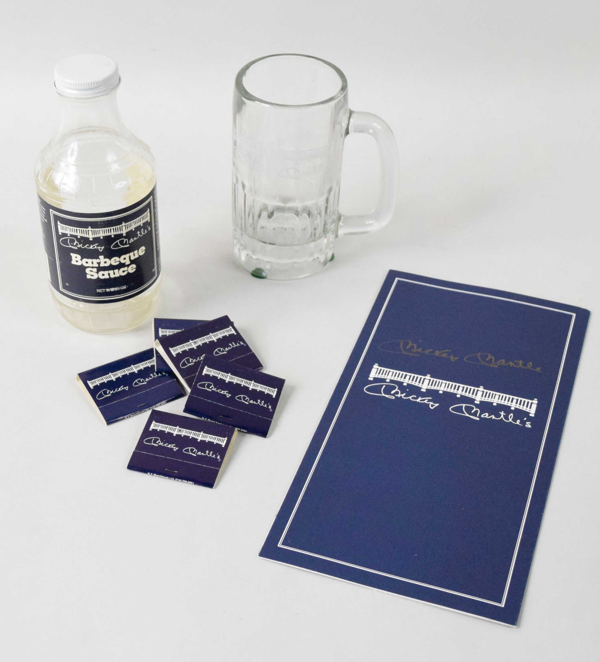 Description:Mickey Mantle signed restaurant menu with related items (EX/MT-NM/MT). Mantle signed the menu in gold marker. Signature rates 9 out of 10. Also includes (25) matchbooks from Mickey Mantle's restaurant, along with a drinking glass, and a jar of Mickey Mantle's Barbeque Sauce (empty): EX/MT-NM/MT