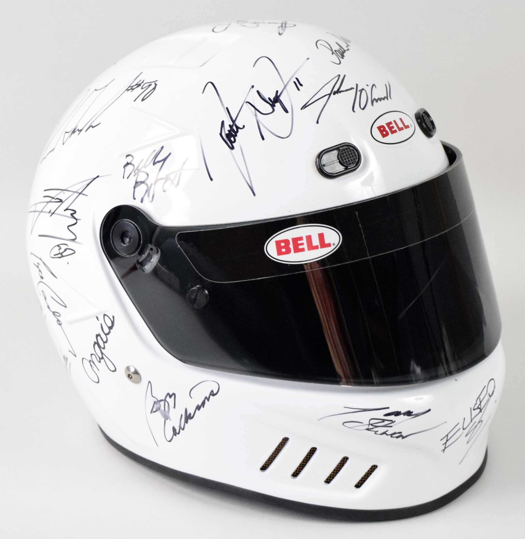Description:Indy Racing League multi-signed helmet, c.mid-late 1990s (EX/MT). Bell size M full size helmet signed by over (30) including Tony Stewart, Arie Luyendyk, Davey Hamilton, Buddy Lazier, Lyn St. James, Roberto Guerrero, Eliseo Salazar, Buzz Calkins (smudge), and others. Signatures rate 5/6 to 10 (avg 7/8) out of 10. Some foam is wearing off under the visor, but is not visible when the visor is closed: EX/MT