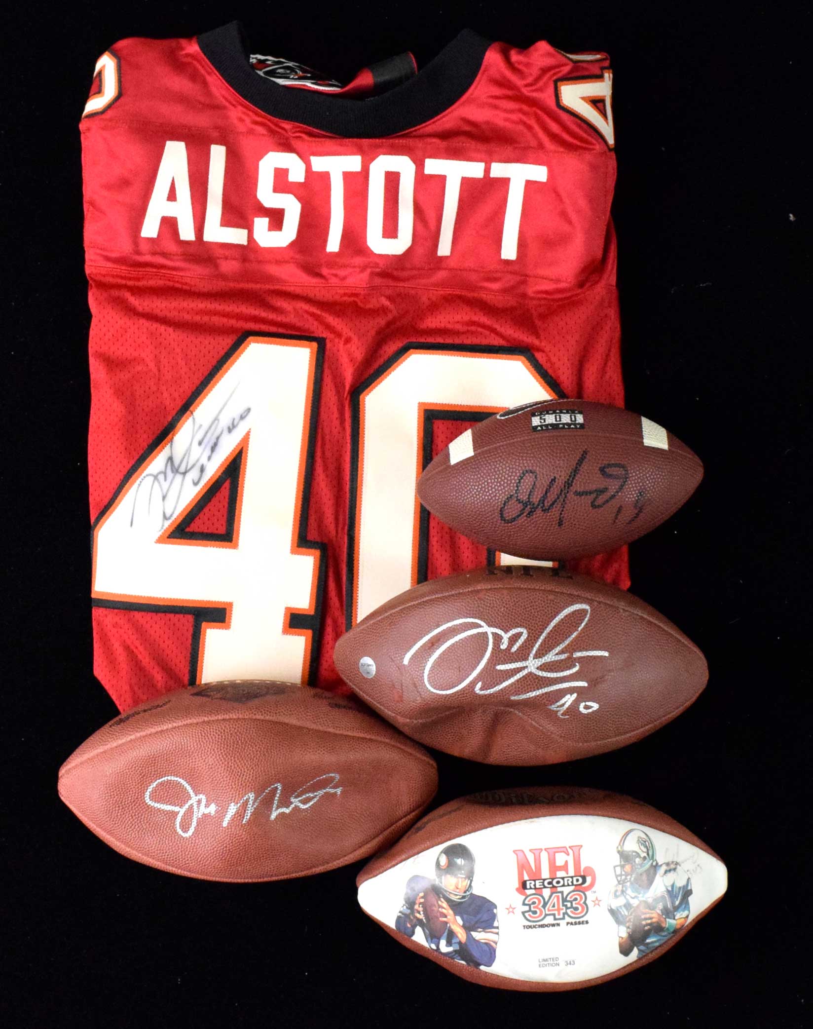 Description:Lot of assorted football autographs (GD-NM). Includes NFL 75th Anniversary football signed by Joe Montana (deflated, and would need a new bladder in order to be fully inflated); Nike mini football signed by Dan Marino; NFL Record 343 TD Passes commemorative football dual-signed by Fran Tarkenton and Dan Marino (faded, deflated, and would need a new bladder in order to be fully inflated); Tampa Bay Buccaneers mini helmet signed by Warrick Dunn; Wilson football signed by Mike Alstott (surface wear); Adidas size 50 Buccaneers #40 Mike Alstott jersey signed by Alstott; and 8"x10" photo signed by Scot Brantley (personalized). Signatures rate 3/4 (dual-signed Marino/Tarkenton ball) to 10 (avg 7) out of 10: GD-NM