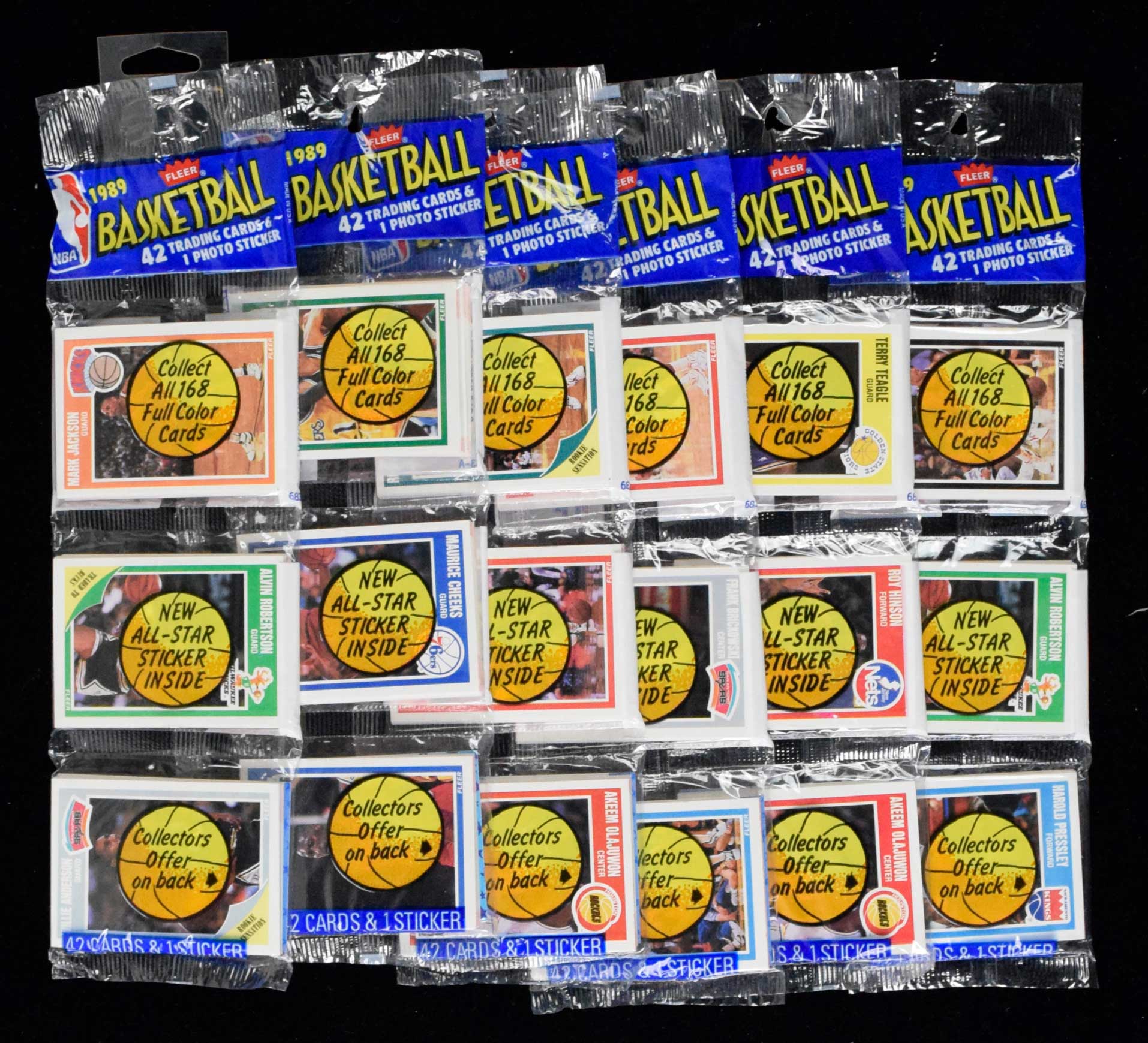 Description:Lot of (6) 1989-90 Fleer Basketball rack packs (NM-NM/MT overall). Each pack contains 42-cards and 1-sticker. Visible cards include Kevin McHale, Maurice Cheeks, Dominique Wilkins, (2) Akeem Olajuwon, and Dennis Rodman. Stickers include (2) Larry Bird, (3) Charles Barkley, and Isiah Thomas: NM-NM/MT overall