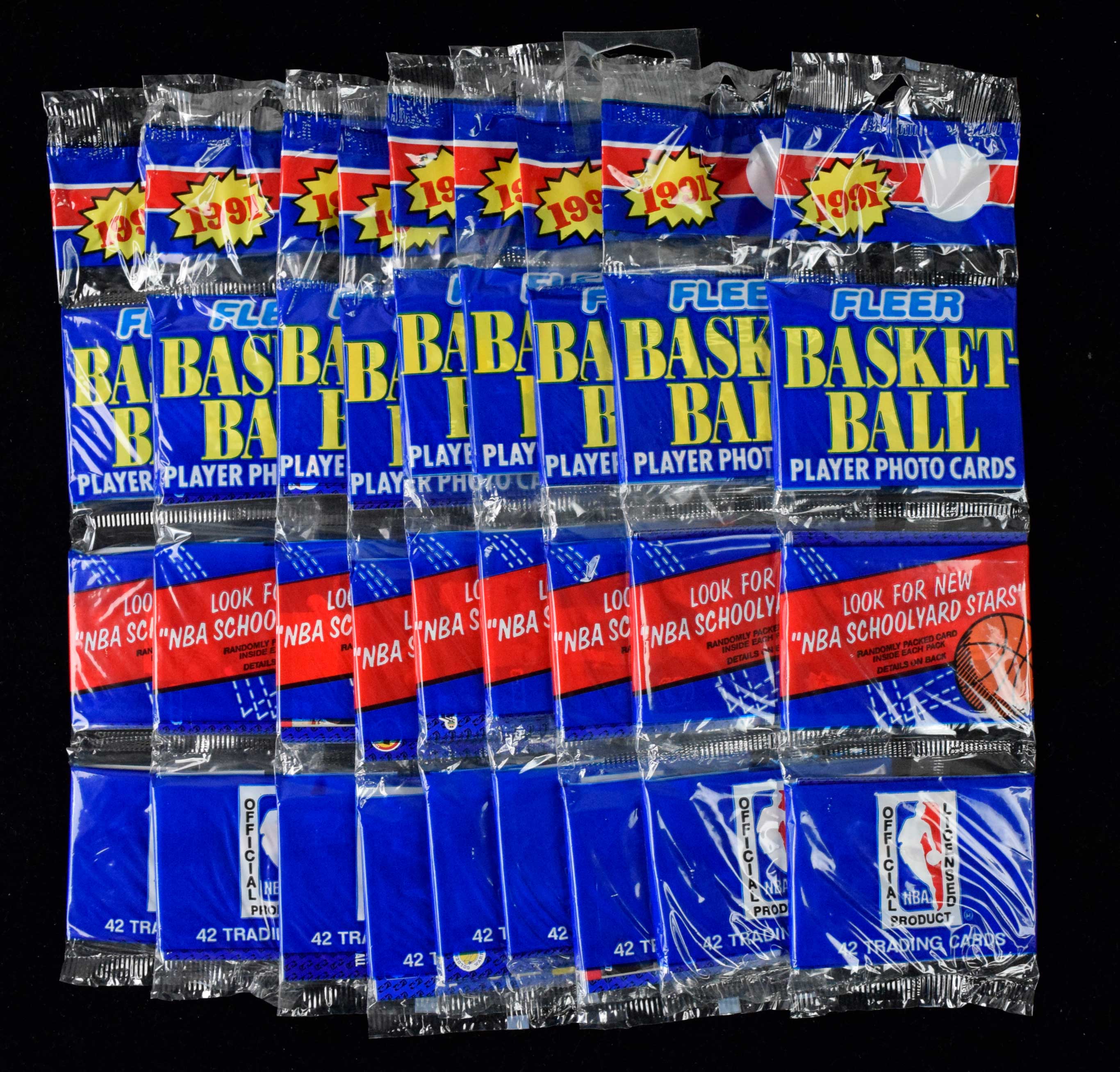 Description:Lot of (9) 1991-92 Fleer Basketball rack packs (NM-NM/MT overall). Each pack contains 42-cards. Visible cards include Kevin McHale, Clyde Drexler, Karl Malone, Charles Barkley, Dominique Wilkins, Reggie Miller, Drazen Petrovic, and Jack Sikma: NM-NM/MT overall