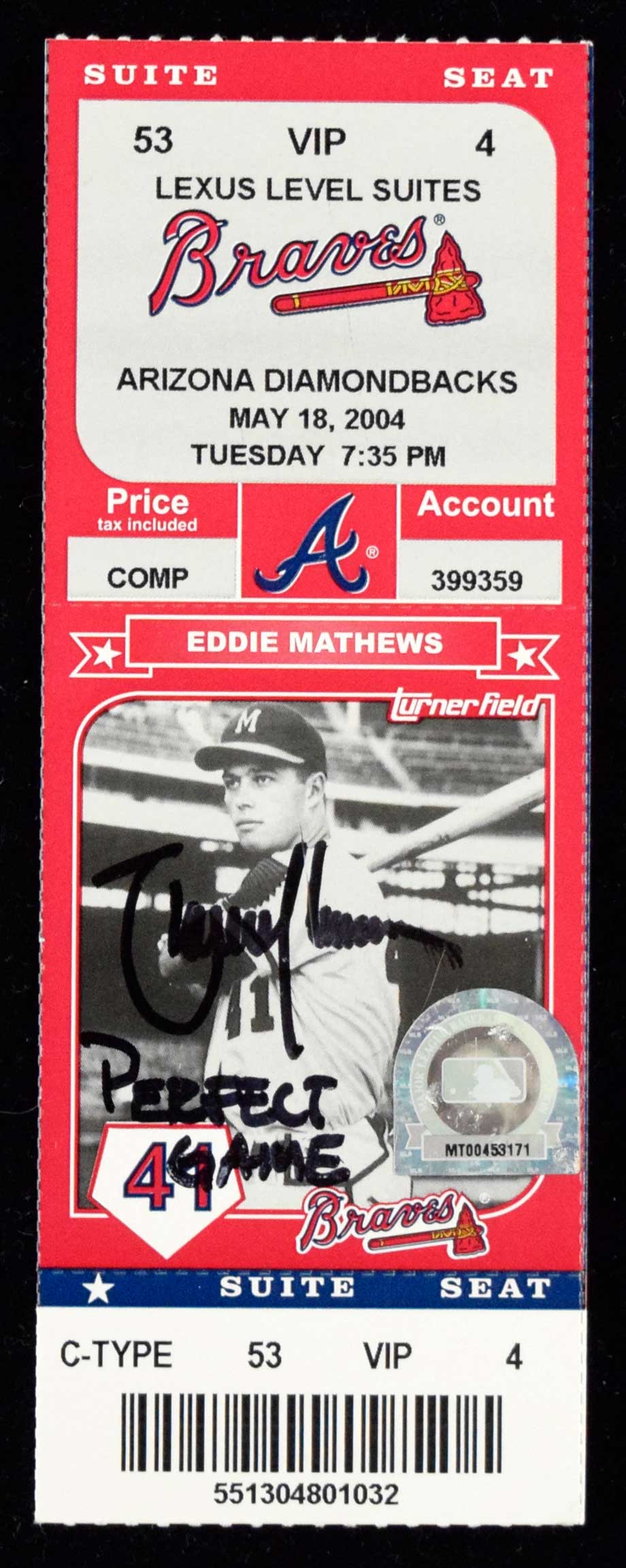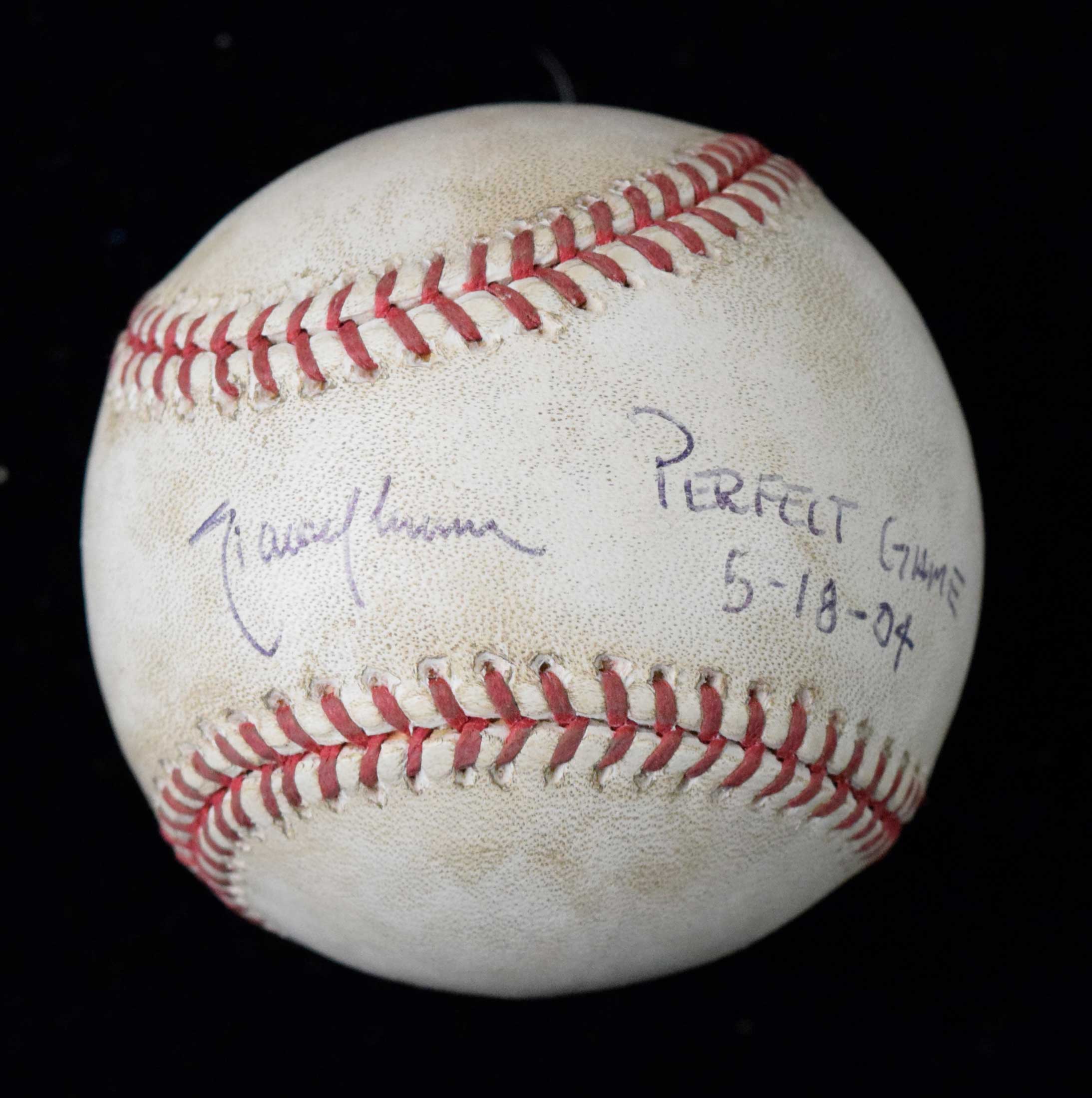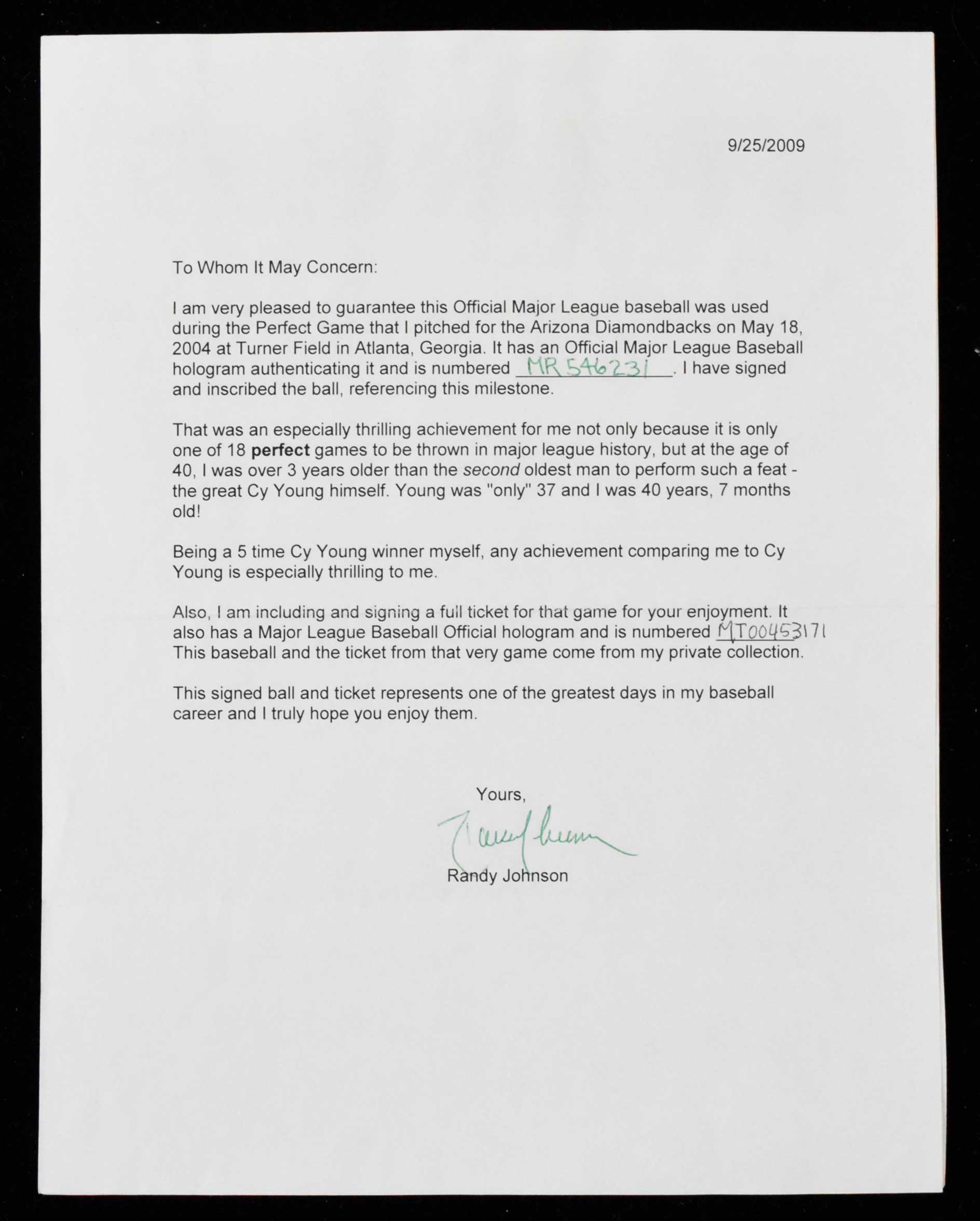 Description:Randy Johnson signed and "Perfect Game" inscribed ball from his May 18, 2004 No-Hitter with signed full ticket and letter of provenance (MLB Authentication) (EX-NM) Includes Rawilngs B.Selig OML ball showing considerable use/wear that has been signed "Randy Johnson" and inscribed "Perfect Game 5-18-04" in ink rating 7-7/8 out of 10. MLB Authentication affixed (MR546231) which confirms use in the Diamondbacks vs. Braves game played at Turner Field. JSA Authentication sticker affixed which pertains to the autograph (JSA COA is included). Also includes a full ticket to the game which has been signed by Johnson and inscribed "Perfect Game" in marker rating 9/10 out of 10 (MLB Authentication hologram affixed - MT00453171 - which relates to the ticket, not autograph). A signed letter of provenance from Johnson references these pieces (with their MLB hologram numbers written in) and states that they are from his personal collection: EX-NM ($2,000-$4,000)