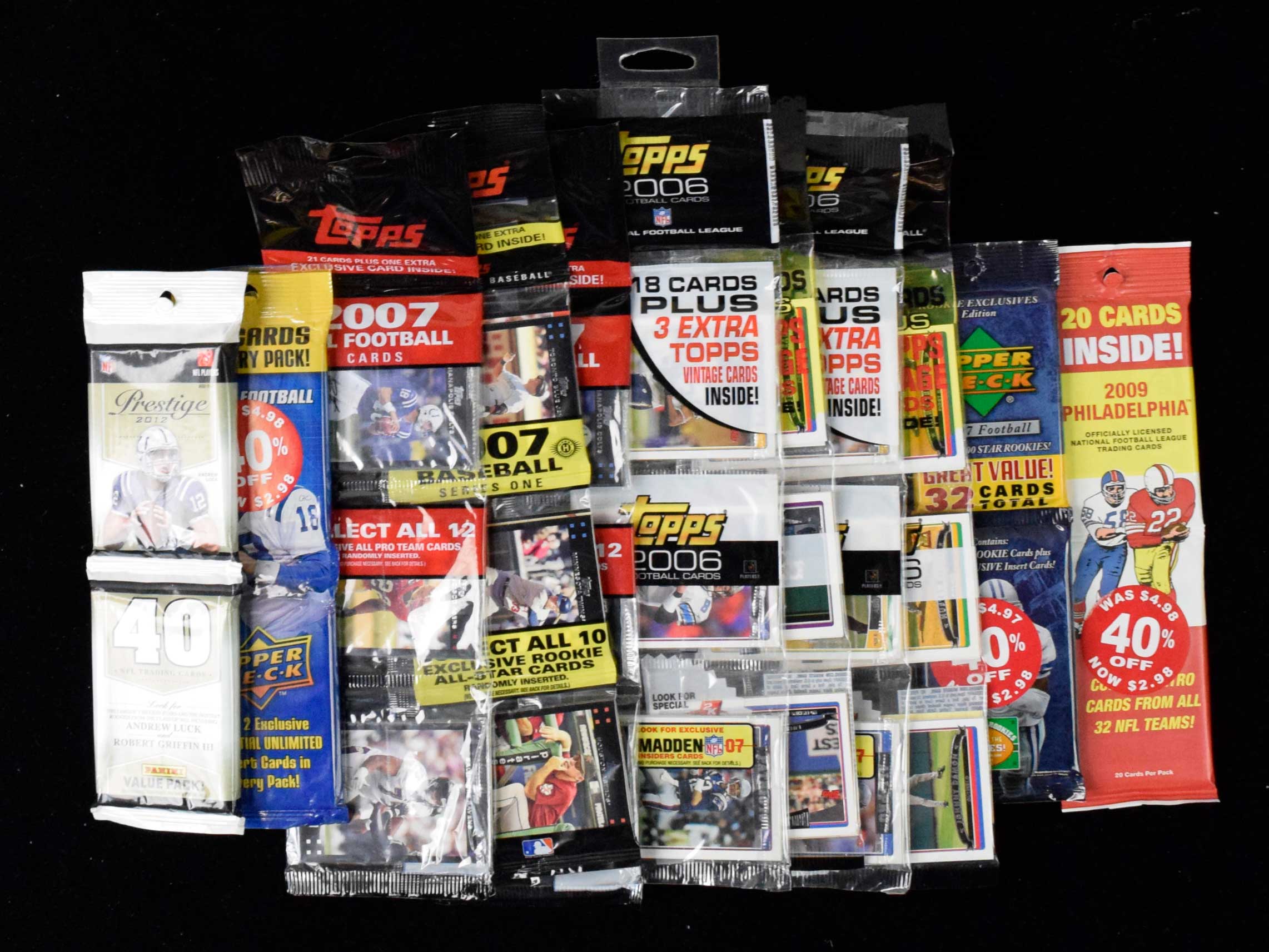 Lot of (15) baseball and football card rack packs from 2006-2012 (NM-NM/MT overall). Includes (2) 2006 Topps Baseball, (3) 2006 Topps Football, (2) 2007 Topps Baseball, (4) 2007 Topps Football, 2007 Upper Deck Football, 2008 Upper Deck Football, 2009 Philadelphia Football, and 2012 Panini Prestige Football: NM-NM/MT overall