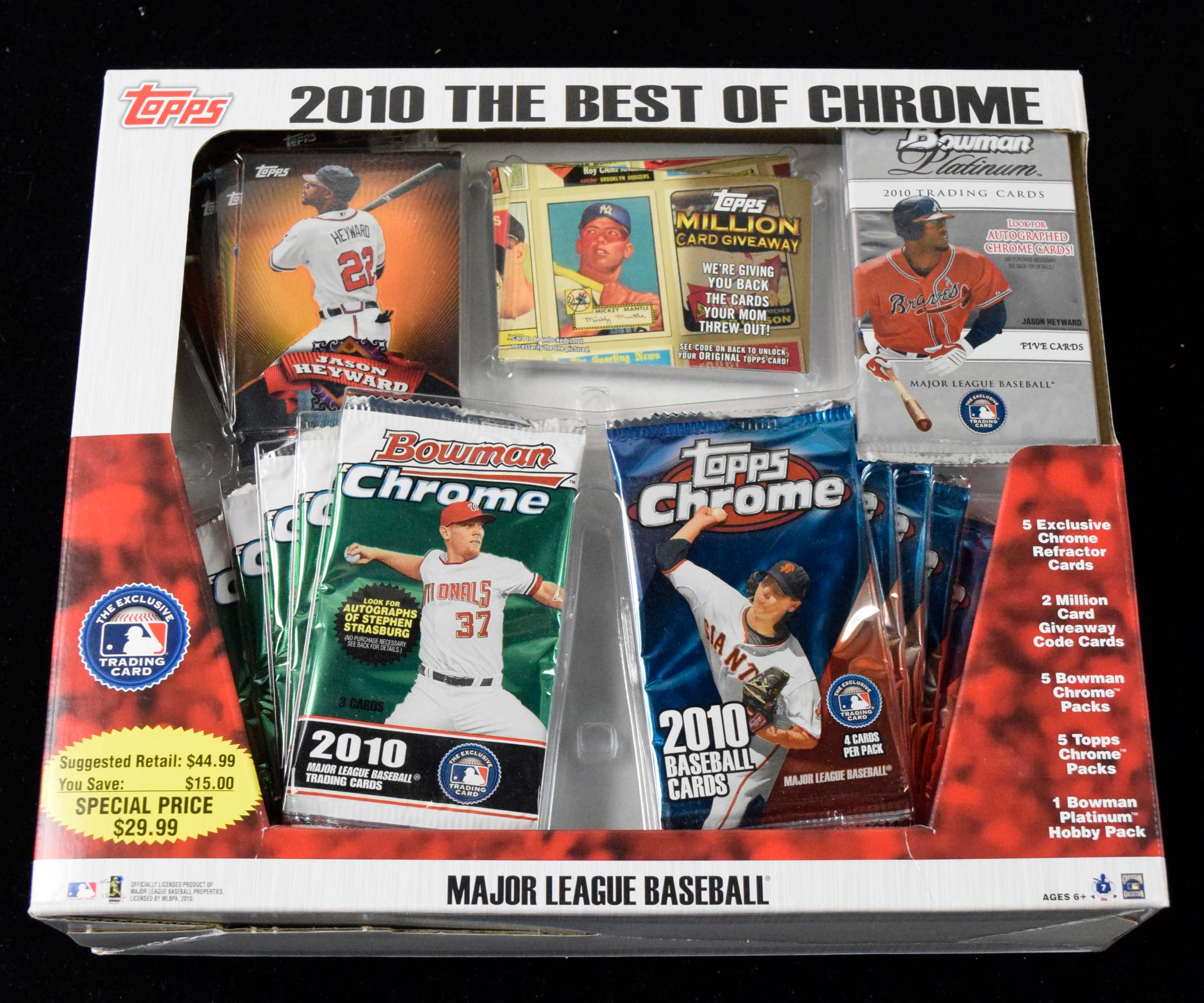 2010 Topps Baseball "Best Of Chrome" factory box (NM/MT). Factory sealed box contains (5) Topps Chrome packs, (5) Bowman Chrome packs, Bowman Platinum pack, and (5) exclusive chrome refractor cards (Jason Heyward visible on top): NM/MT