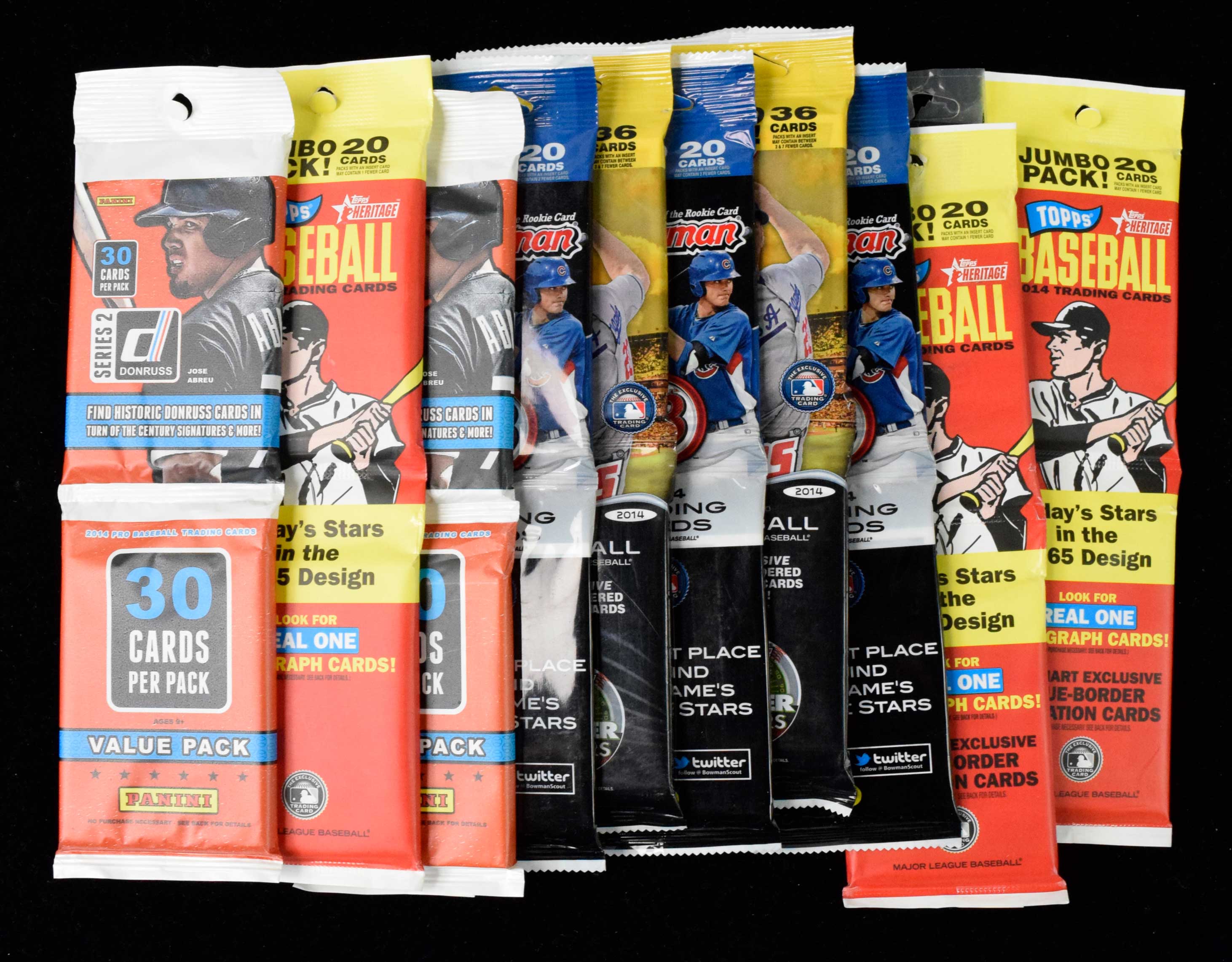 Description:Lot of (10) 2014 baseball card jumbo value packs (NM-NM/MT overall). Includes (2) Topps series 2, (3) Topps Heritage, (3) Bowman, and (2) Panini Donruss series 2: NM-NM/MT overall