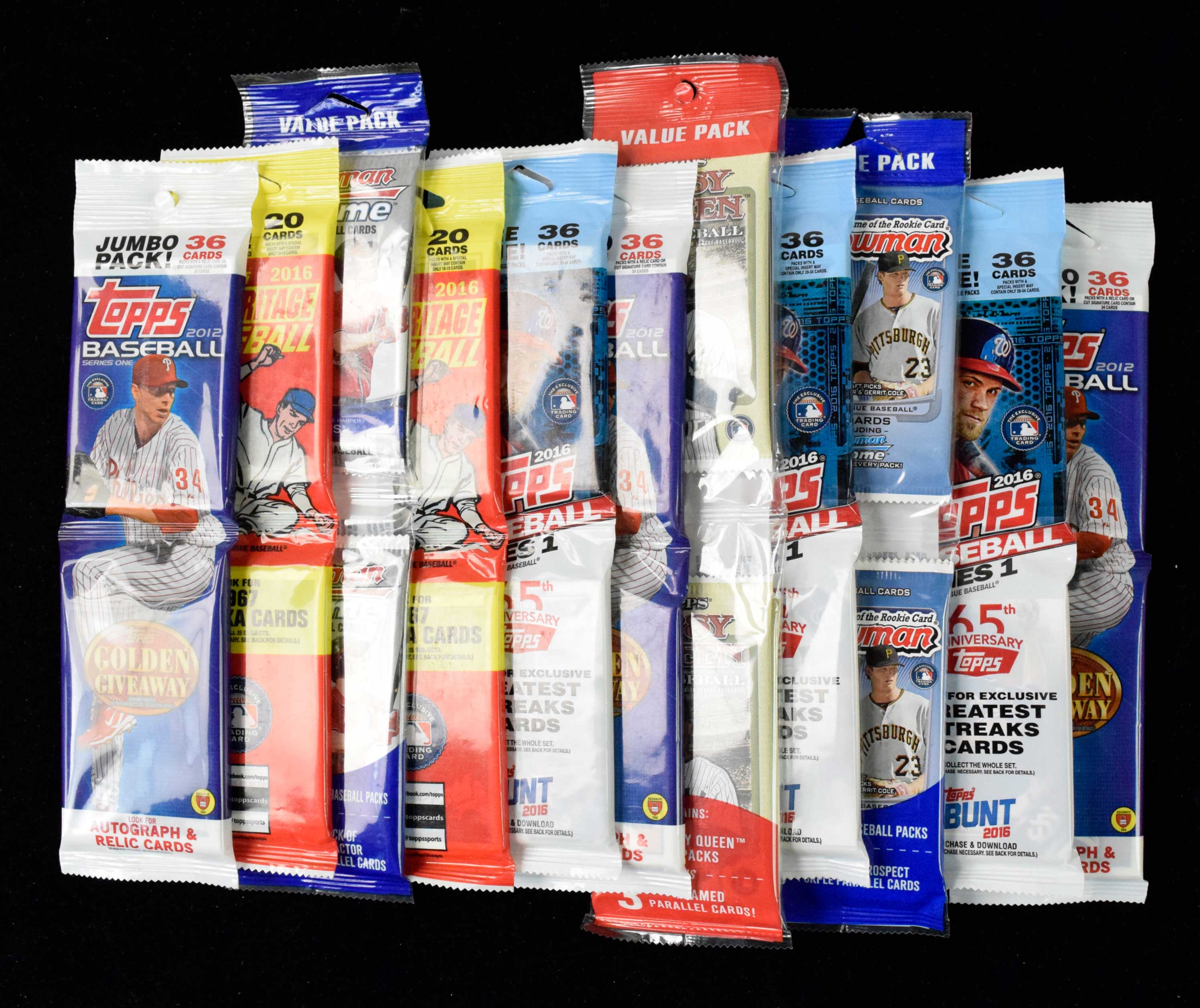 Lot of (14) baseball card jumbo value packs from 2012-2016 (NM-NM/MT overall). Includes (3) 2012 Topps series 1, 2012 Topps Gypsy Queen, 2012 Bowman, 2012 Bowman Chrome, (4) 2016 Topps series 1, and (4) 2016 Topps Heritage: NM-NM/MT overall