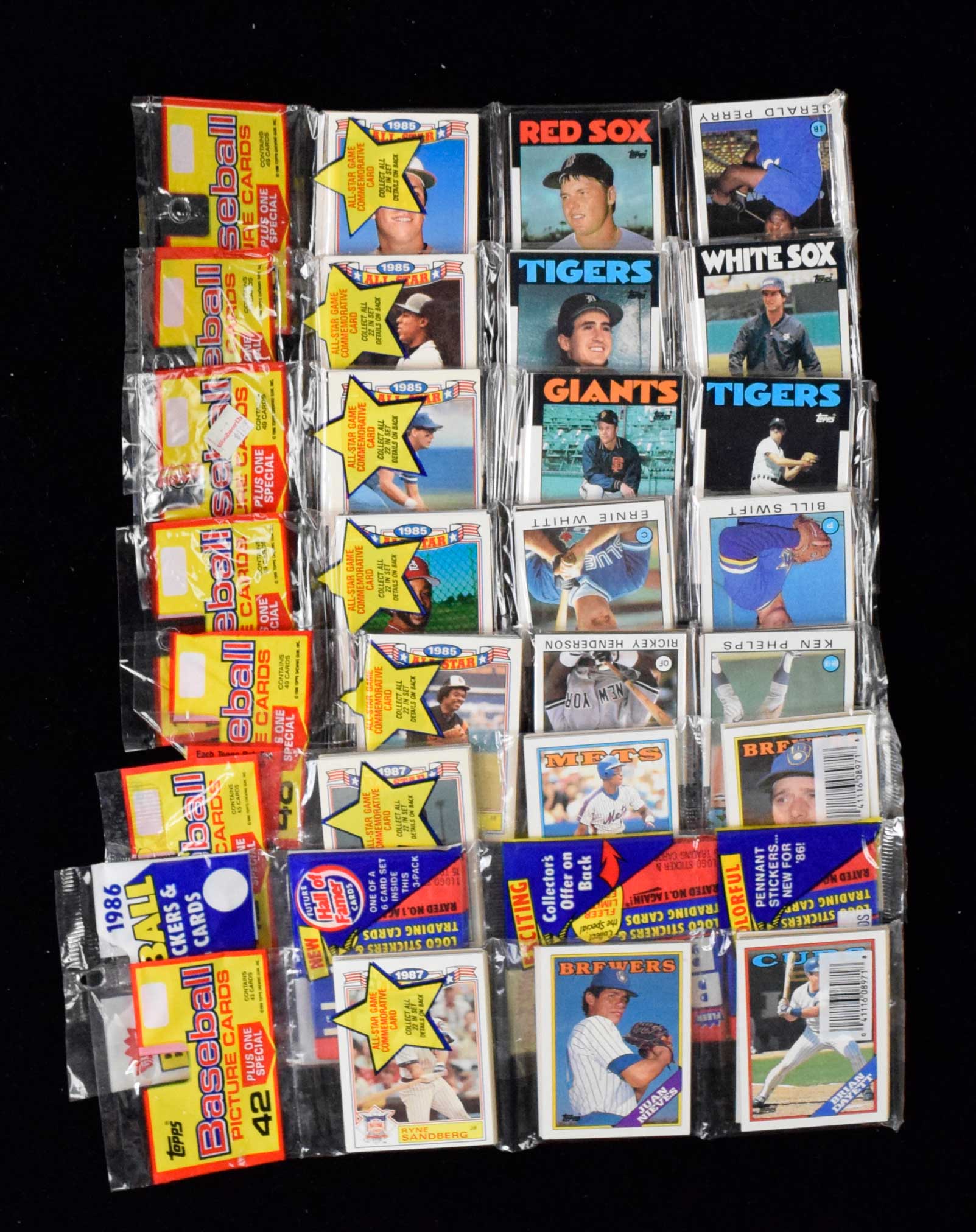 Lot of (30) baseball card rack packs from 1986-1988 (NM-NM/MT overall). Includes 1986 Topps rack box (24 packs), (2) 1986 Fleer rack packs, 1987 Topps rack pack, and (3) 1988 Topps rack packs: NM-NM/MT overall