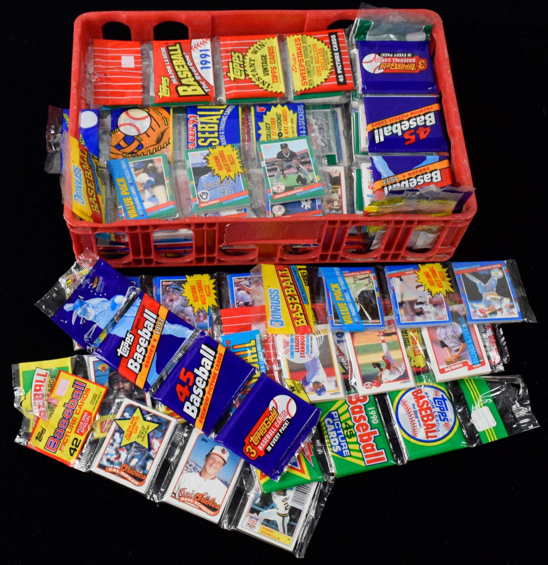 Lot of (53) baseball card rack packs from 1989-1993 (NM overall). Includes 1989 Topps, 1989 Bowman, (2) 1990 Topps, 1990 Bowman, (10) 1990 Fleer, (4) 1991 Topps, 1991 Bowman, (7) 1991 Donruss series 1, (4) 1991 Donruss series 2, (4) 1991 Fleer, (2) 1992 Topps, (6) 1992 Fleer, (2) 1993 Topps series 1, (2) 1993 Topps series 2, (3) 1993 Fleer series 1, and (3) 1993 Fleer series 2: NM overall