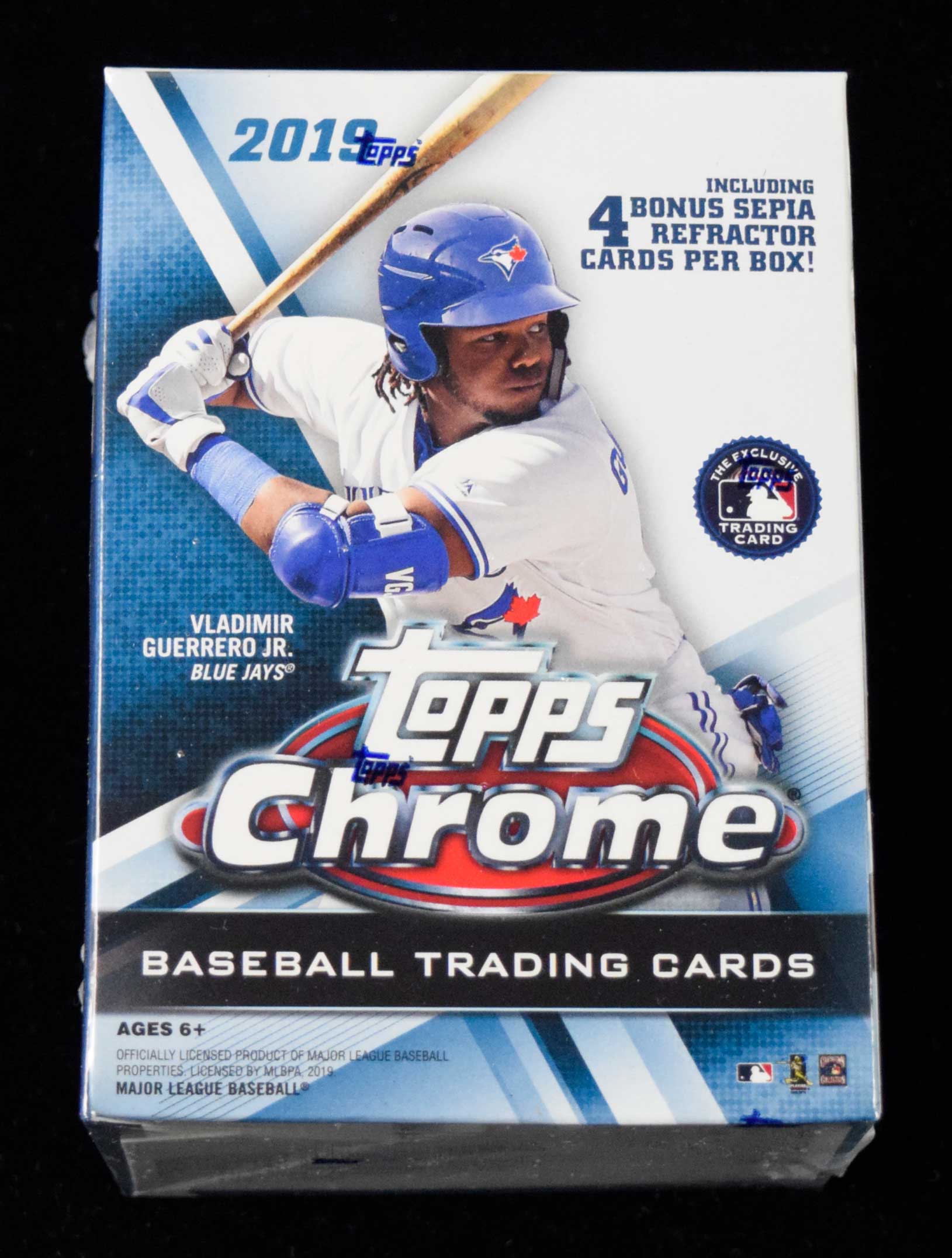 2019 Topps Chrome baseball blaster box (NM/MT). Contains 8-packs plus (4) sepia refractor cards per box. Remains factory sealed, with minimal handling/storage wear: NM/MT