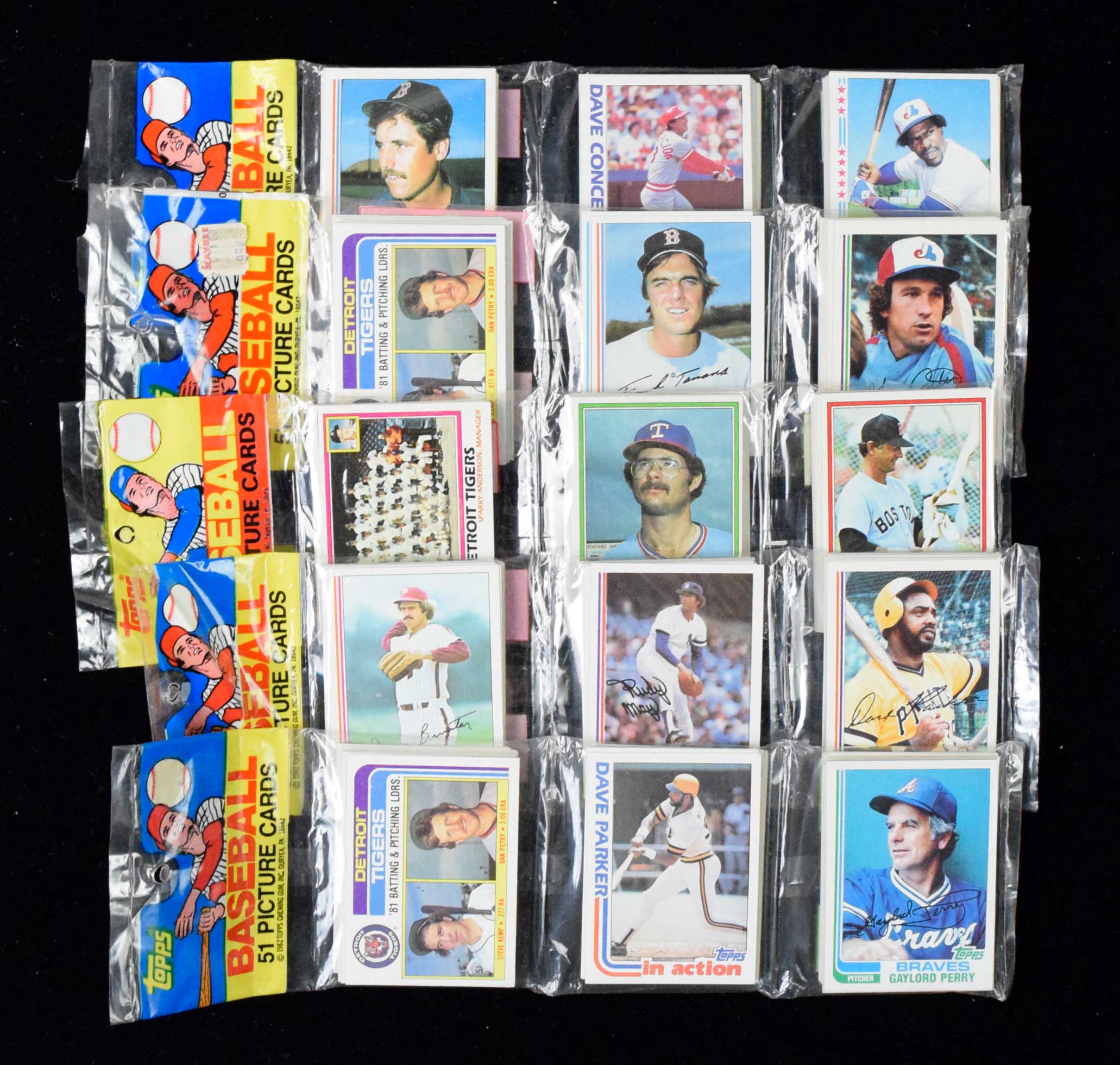Description:1981 and (4) 1982 Topps Baseball rack packs (NM-NM/MT overall). Includes 1981 Topps rack pack with Carl Yastrzemski visible; and (4) 1982 Topps rack packs with visible cards including Gary Carter, Gaylord Perry, Andre Dawson, and Harold Baines: NM-NM/MT overall