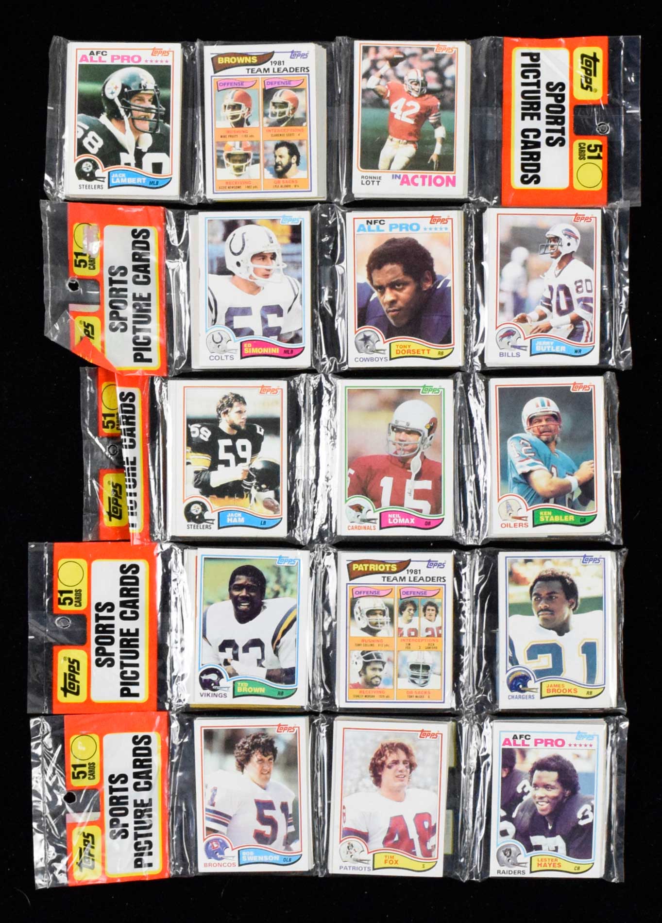 Description:Lot of (10) 1982 Topps Football rack packs - some with stars showing (EX-NM) Includes pack with Jack Ham and Ken Stabler on top; pack with Tony Dorsett on top; pack with Ronnie Lott In Action and Jack Lambert on top; pack with Lester Hayes All Pro on top; and pack with Dan Hampton on top. Light to mild general handling and storage wear: EX-NM ($750-$1,000)