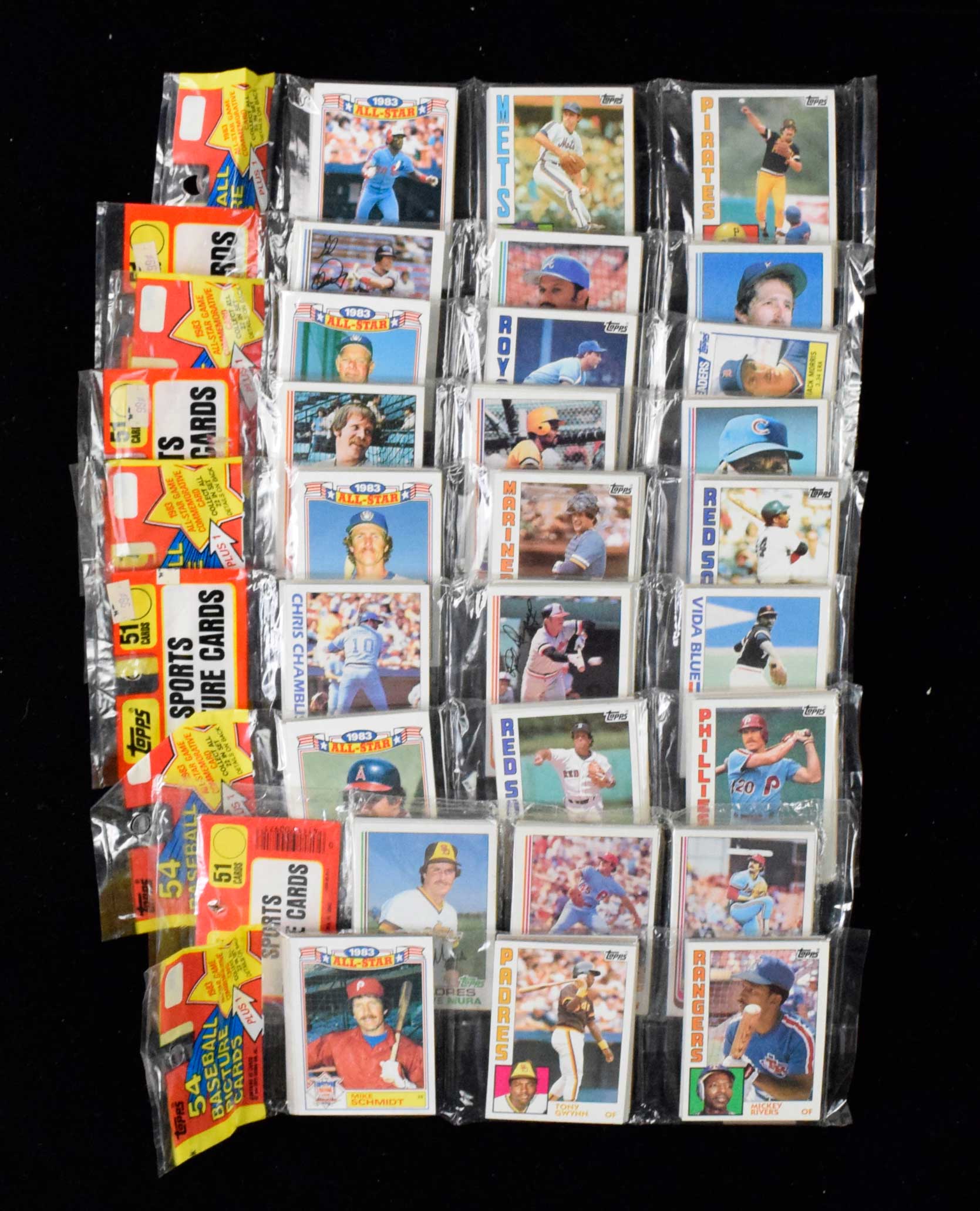 Description:Lot of (9) 1982 and 1984 Topps Baseball rack packs (NM overall). Includes (4) 1982 Topps rack packs each containing 51-cards (light wear to a couple wrappers, and some edge wear to a Chambliss card on top), and (5) 1984 Topps rack packs each containing 55-cards: NM overall
