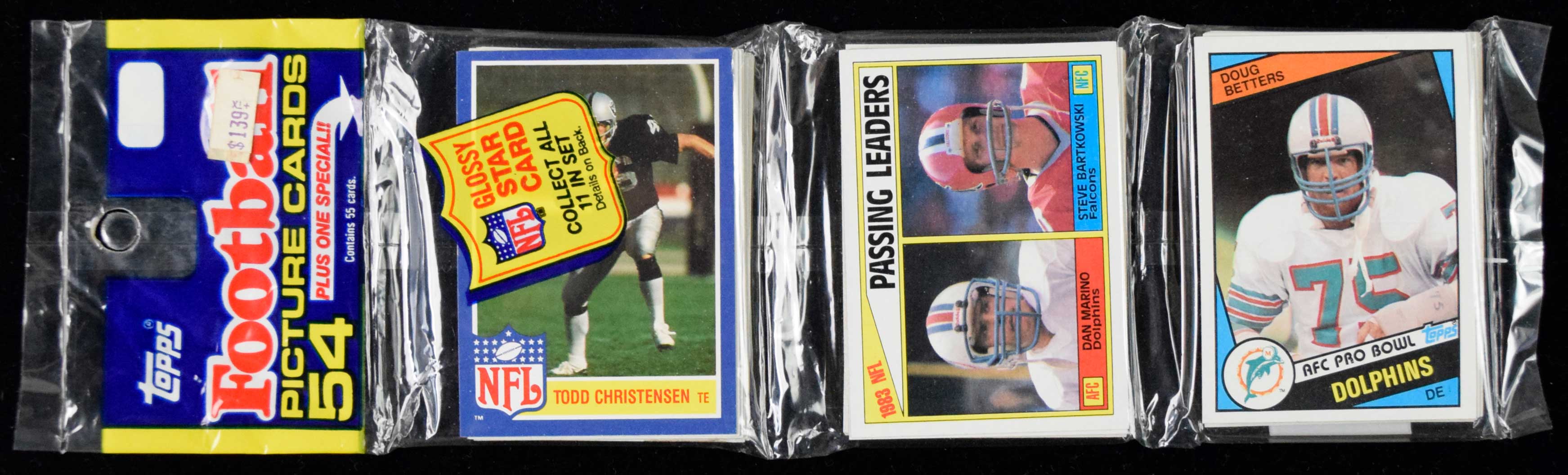 Description:1984 Topps Football rack pack (NM overall). Contains 55-cards including Passing Leaders with Dan Marino visible on top, and Walter Payton visible on the bottom: NM overall