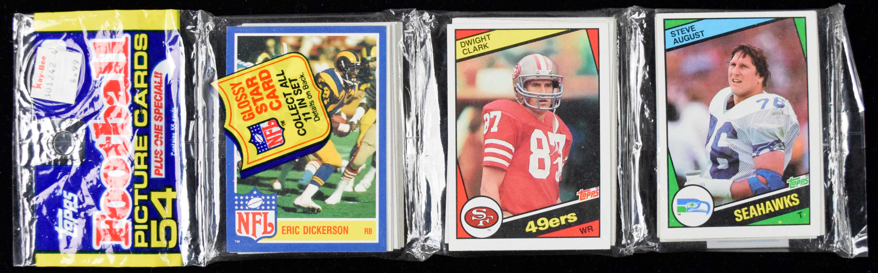 1984 Topps Football rack pack (NM overall). Contains 55-cards including Eric Dickerson rookie insert card visible on top: NM overall