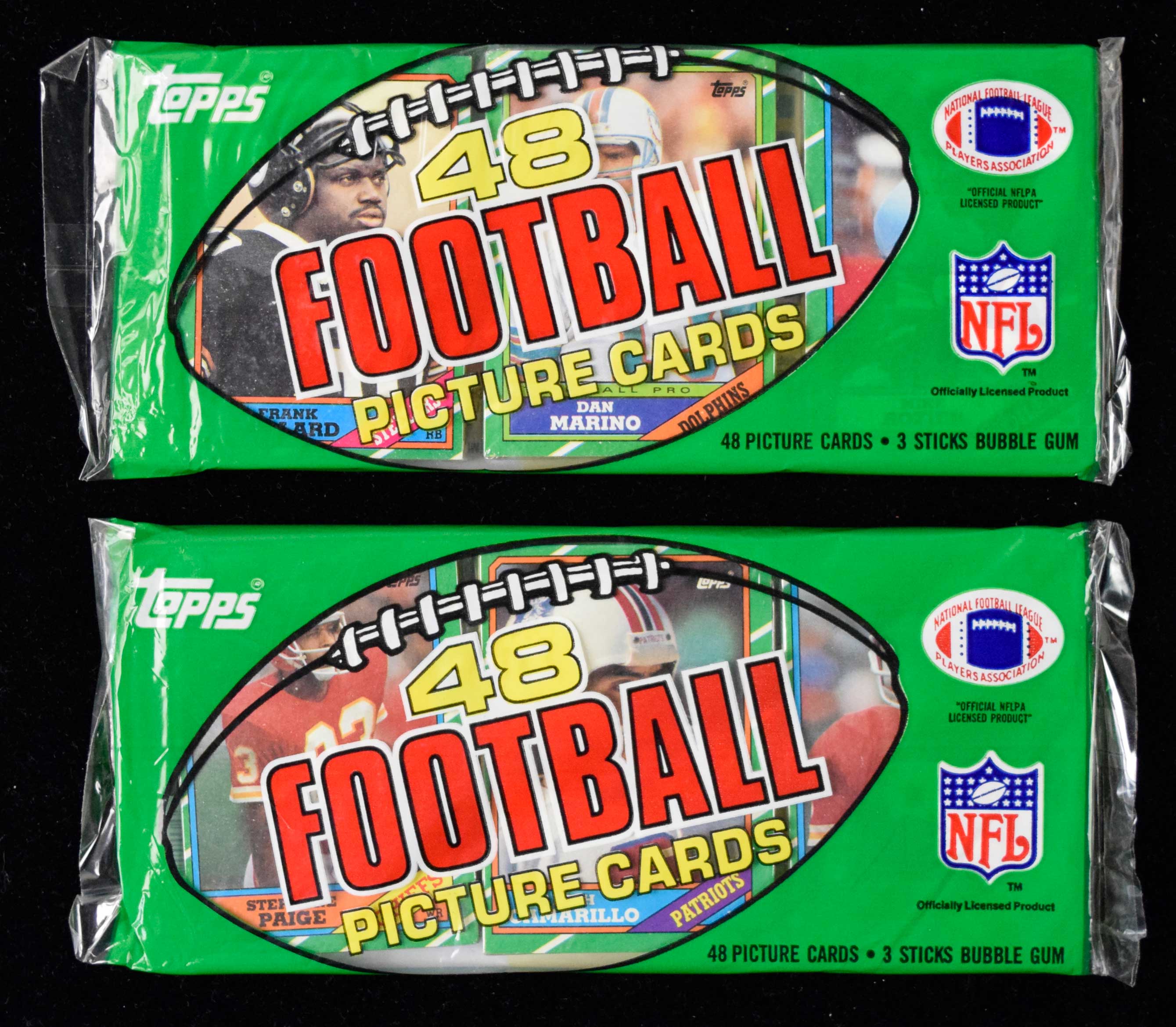 Description:Lot of (2) 1986 Topps Football grocery rack packs - one with Dan Marino on top and Walter Payton on back (EX/MT-NM) Pair of unopened rack packs which each contain (3) cello packs. One has a Dan Marino card visible on top and Walter Payton on back. Touch of light handling and storage wear: EX/MT-NM ($400-$600)