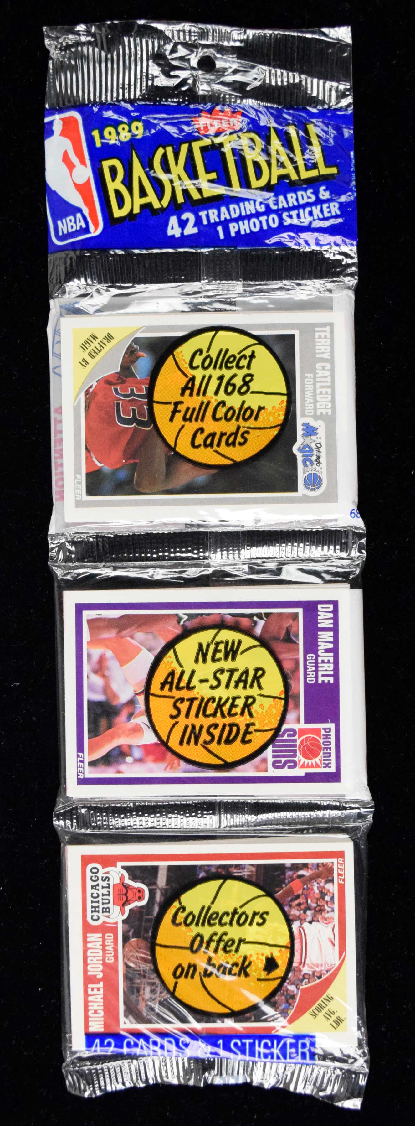 Description:1989-90 Fleer Basketball rack pack with visible Jordan (NM overall). Contains 42-cards and an All-Star sticker insert (Isiah Thomas). Michael Jordan is visible on top: NM overall