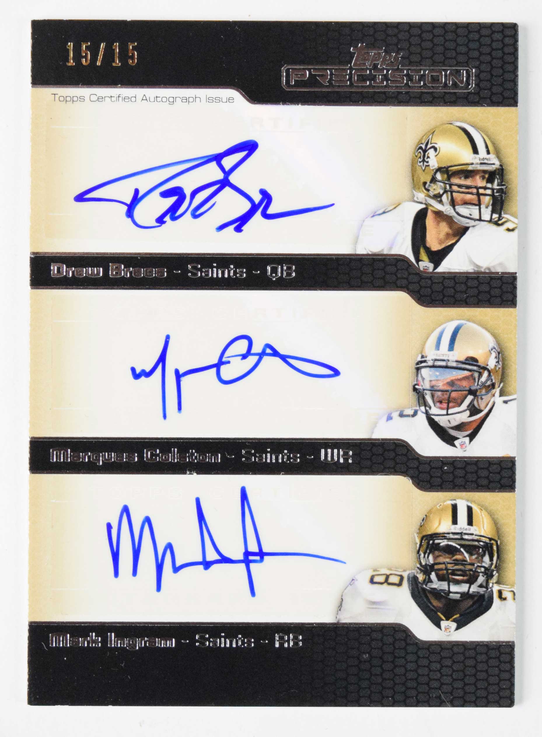 Description:Drew Brees, Marques Colston, and Mark Ingram multi-signed serial #ed insert card (NM). 2011 Topps Precision "Autographs Triple" #PCTA-BCI signed by all three in blue fine tip marker. Signatures rate 9 to 10 out of 10. The card is #ed 15/15: NM