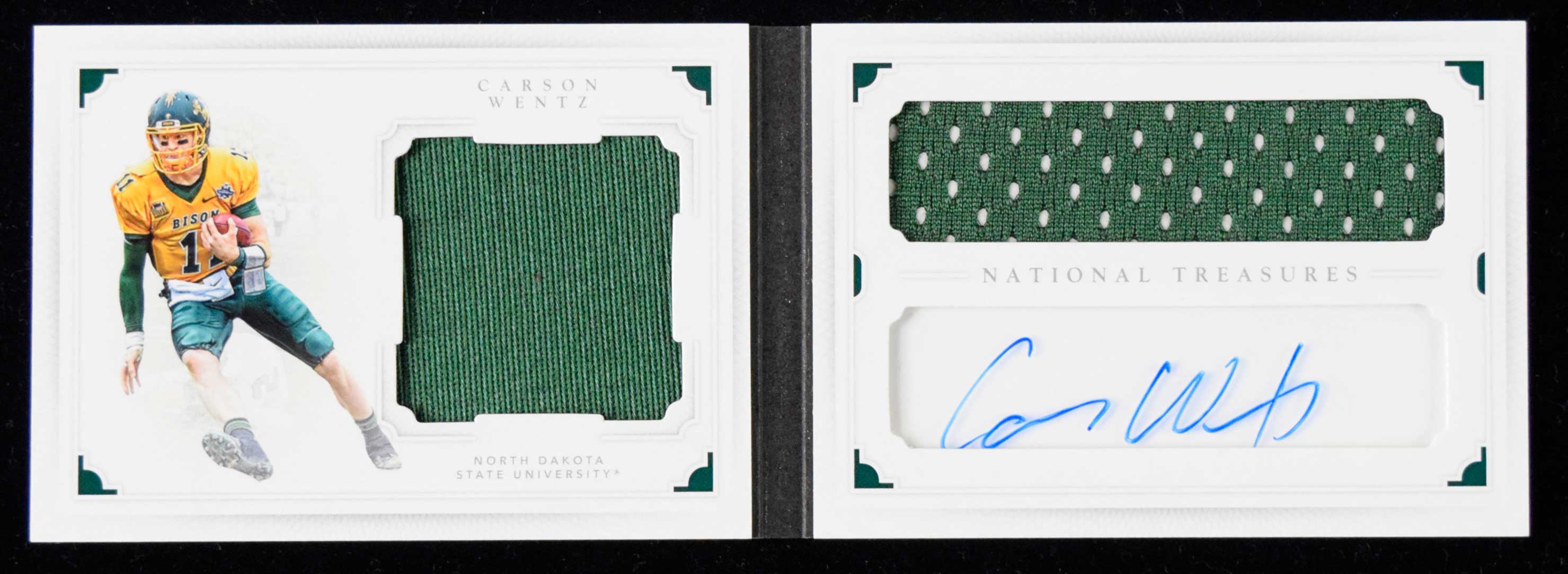 Description:2016 Carson Wentz signed relic booklet serial #ed insert card (NM). 2016 Panini National Treasures Collegiate "Combo Player Signature Booklet" #9 containing two pieces of game worn uniform, and signed by Wentz blue fine tip marker. Signature rates 9 out of 10. Numbered 30/99: NM