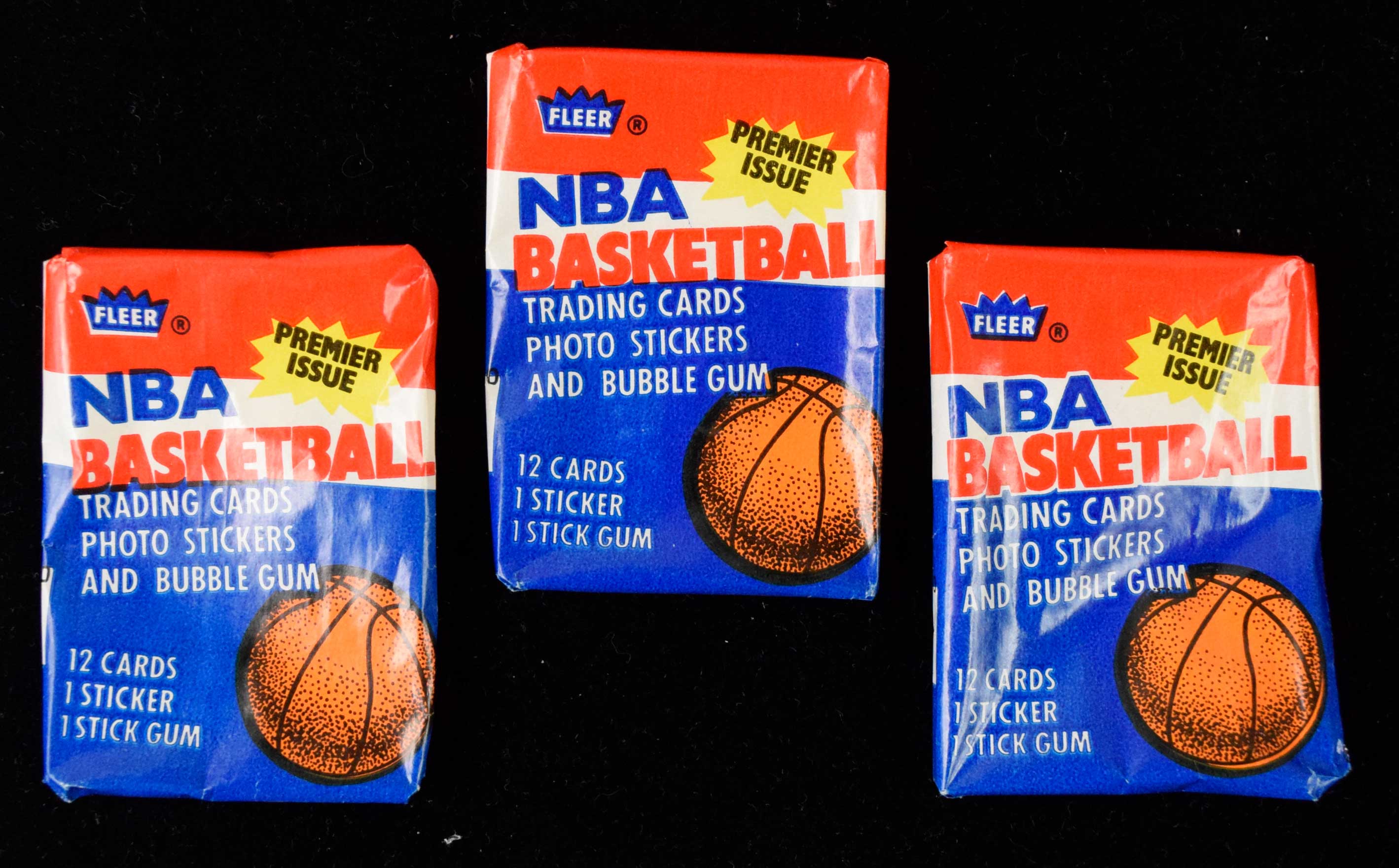 Description:Lot of (3) 1986-87 Fleer Basketball wax pack wrappers (EX-NM). Includes two with Dubble Bubble advertising, and the other advertising Razzles. Onky minor handling wear: EX-NM