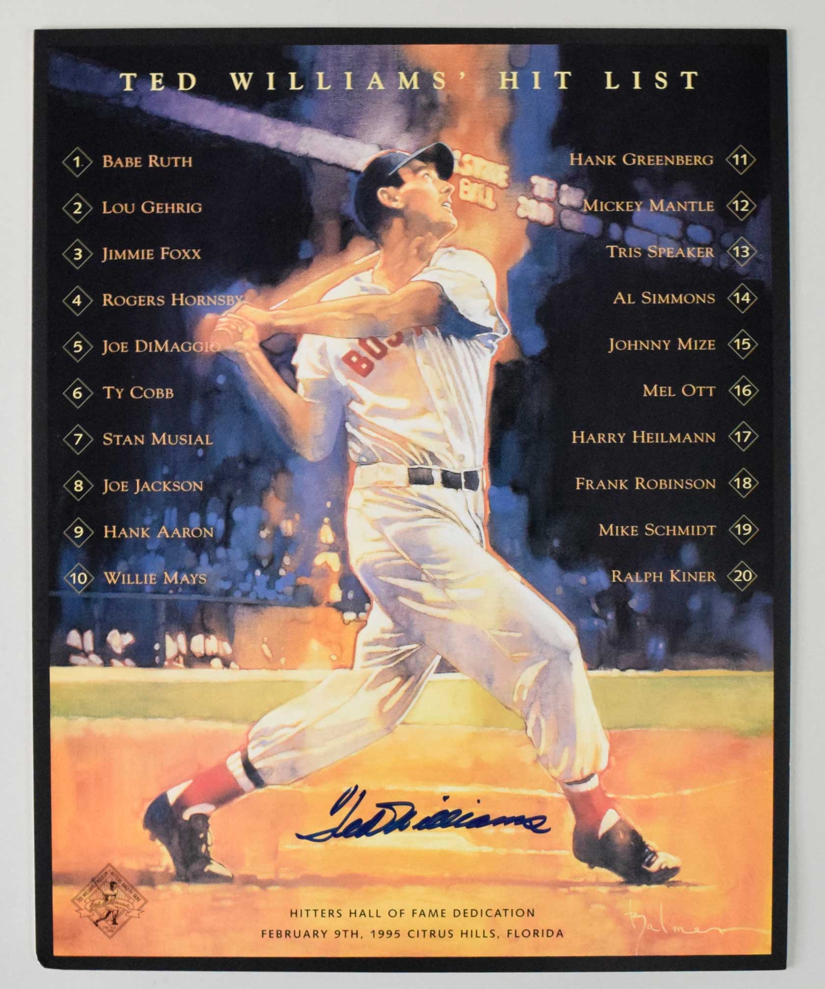 Description:Ted Williams signed Hitters Hall Of Fame print (EX/MT). 16"x20" posterboard print signed by Williams in blue marker. Signature rates 9/10 out of 10. Minor indentation at bottom left corner: EX/MT