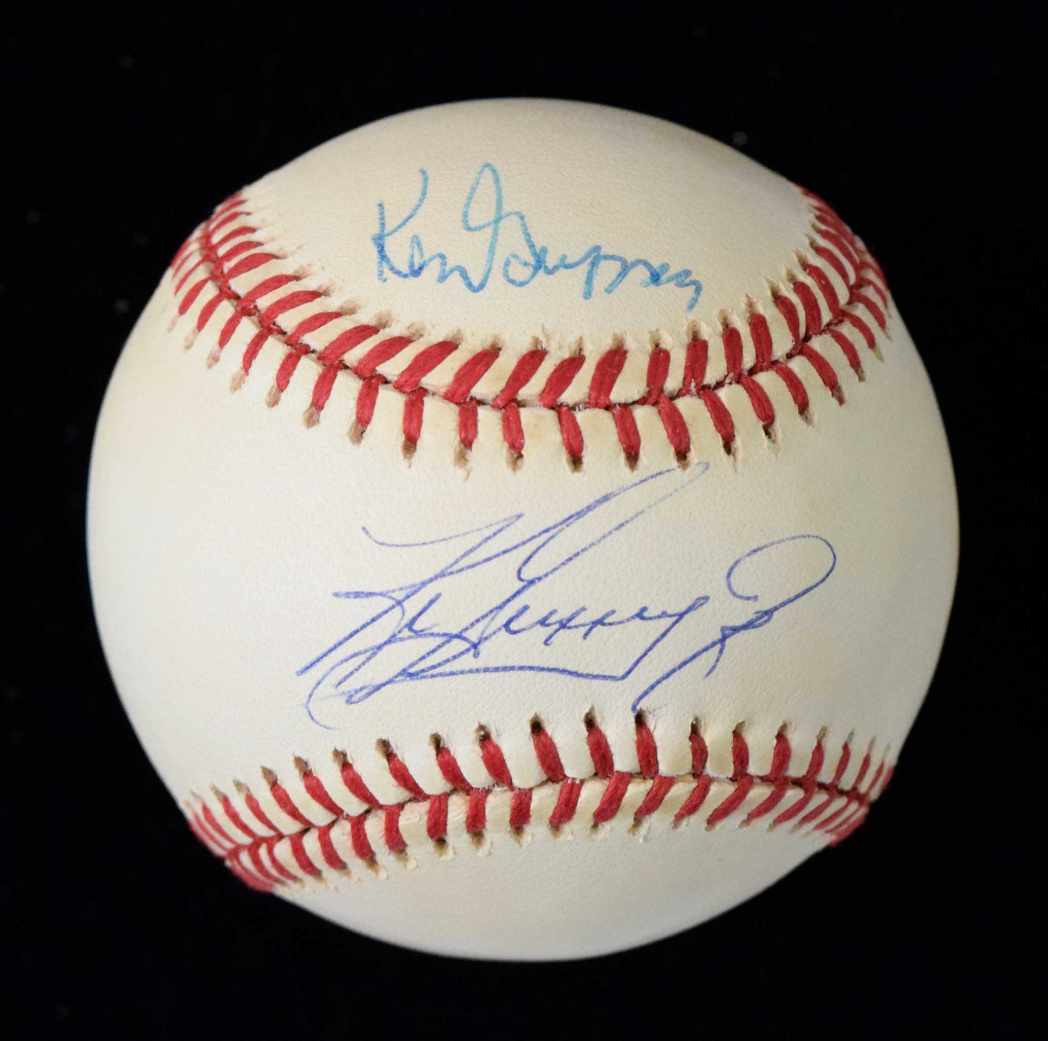 Description:Ken Griffey Jr. and Ken Griffey Sr. dual-signed baseball (EX/MT). B.Brown AL ball signed by the father and son in blue ink. Signatures rate 8 to 9 out of 10. Light toning: EX/MT